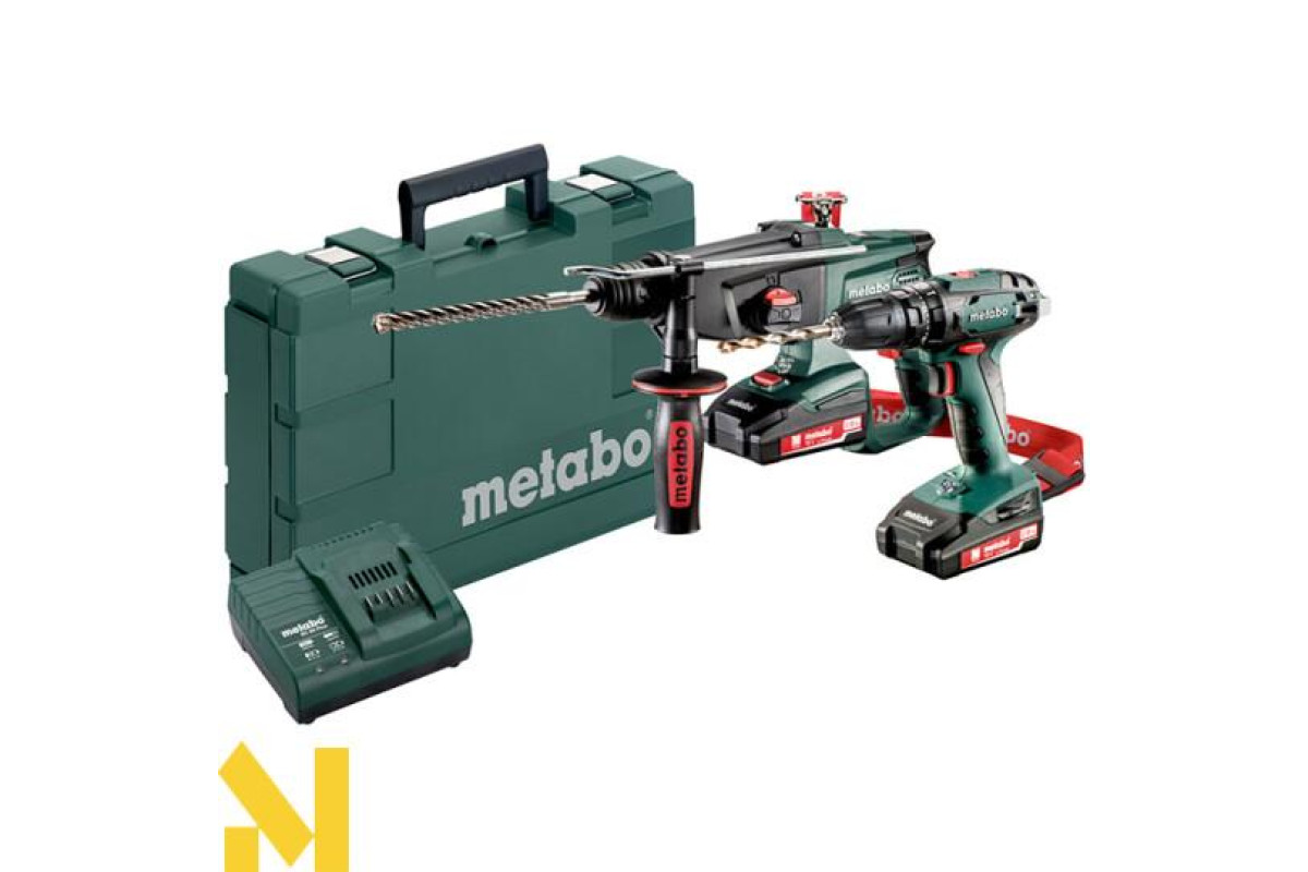 Комплект інструменту Metabo Combo 2.3.4 18 V складається з акумуляторного ударного шуруповерта Metabo SB 18, акумуляторного перфоратора Metabo KHA 18 LTX і двох акумуляторів Li-Power 18 В / 2,0 Ач із зарядним пристроєм.