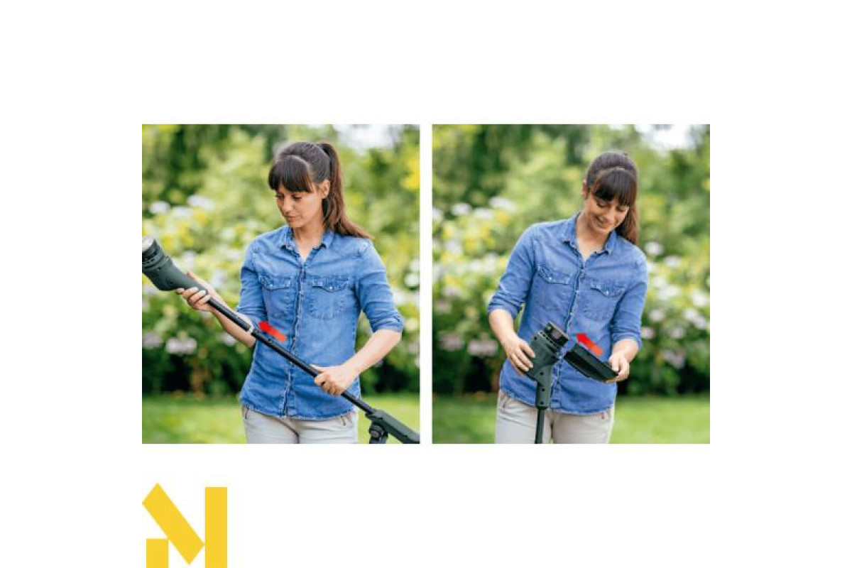 Тример легко і швидко збирати. Просто з'єднайте дві частини штанги та посуньте запобіжник ножа – інструмент готовий до роботи.