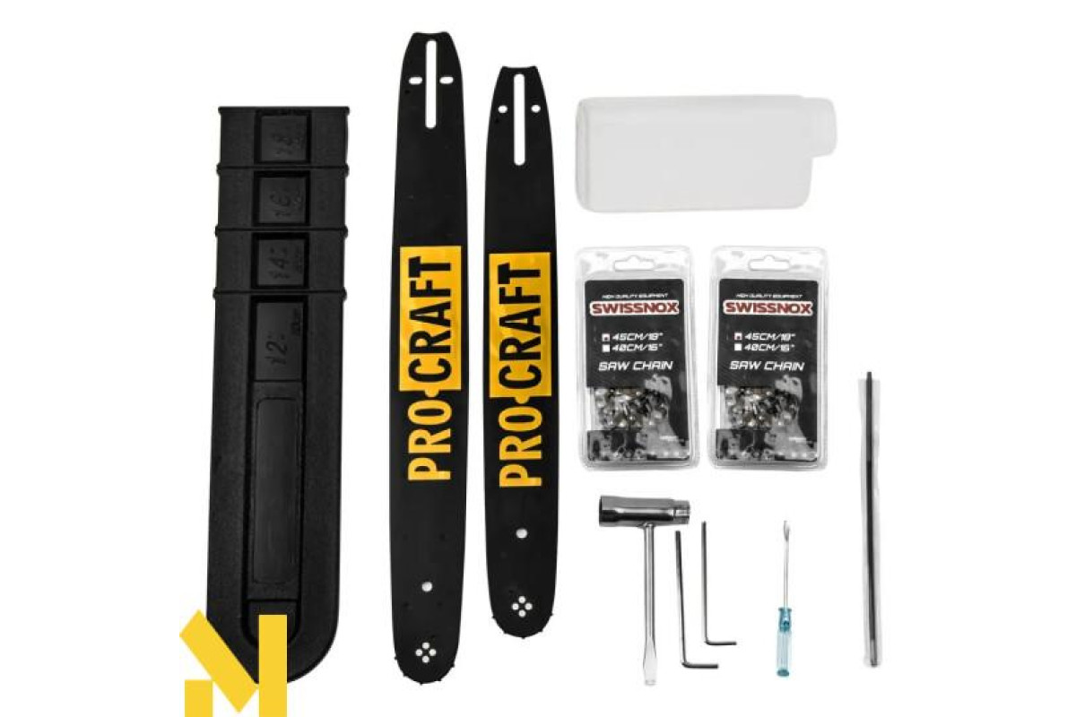 Бензопила Procraft K450 укомплектована шиною і ланцюгом в двох варіантах - 40 і 45 см, що дає можливість використовувати її при виконанні різних видів робіт. Завдяки міцним і якісним матеріалам, термін експлуатації її не обмежений, а заточка ланцюгів потрібна вкрай рідко.