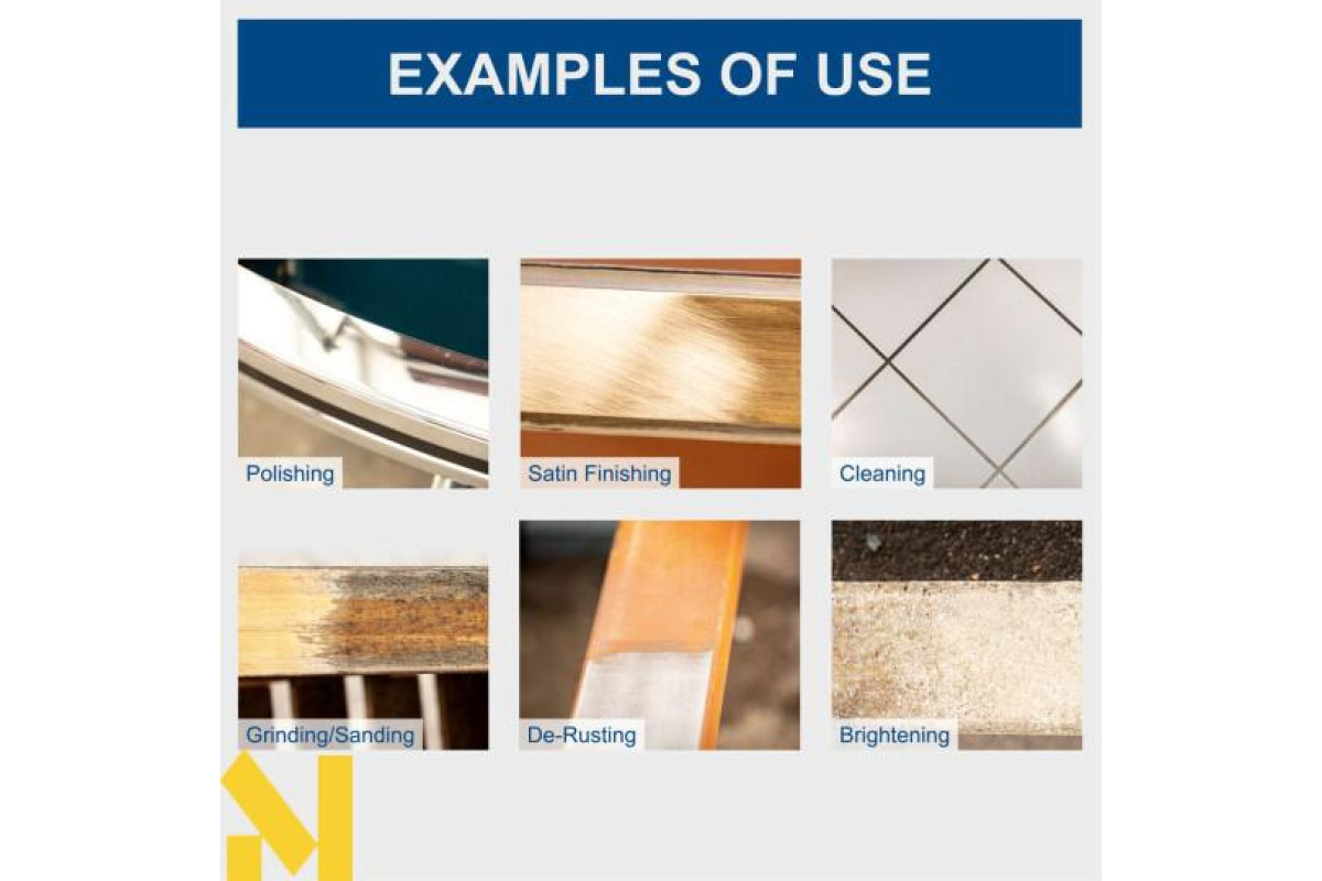 Універсальність: ідеально підходить для шліфування, полірування, шліфування чи очищення дерева, металу, каменю, плитки, пластику та пофарбованих поверхонь.