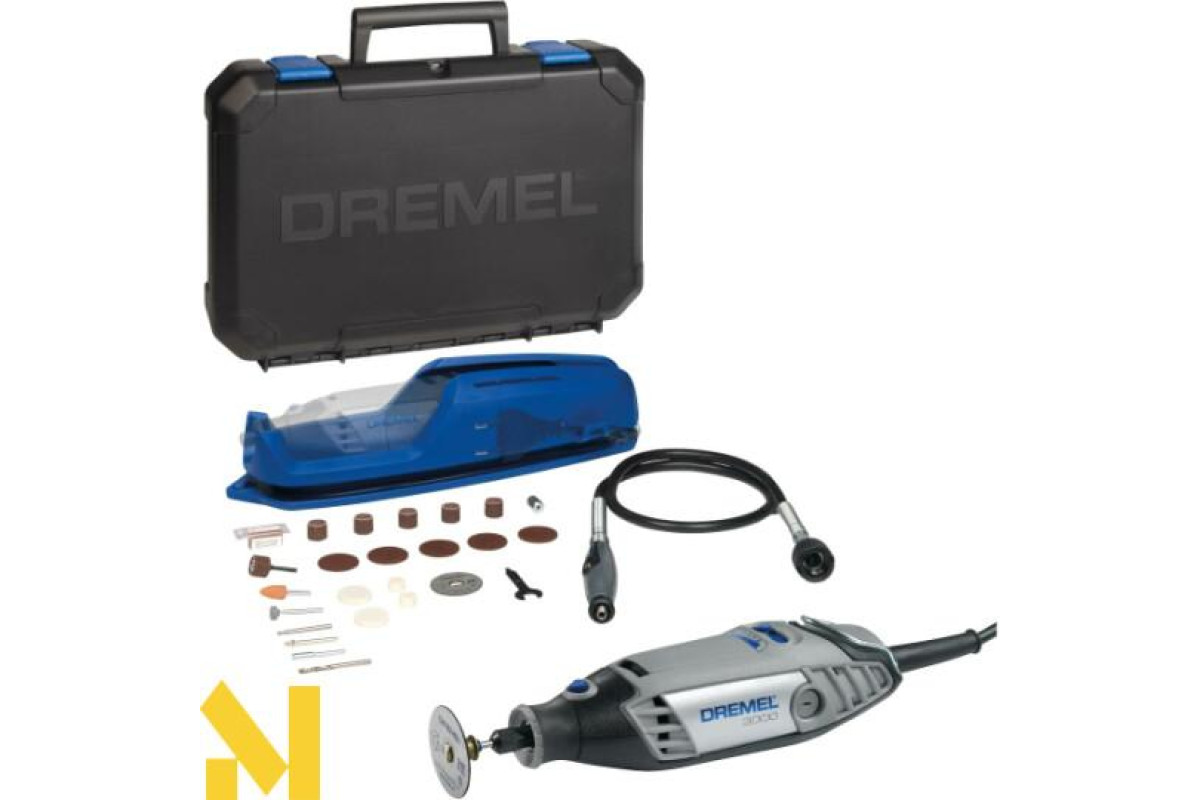 Dremel 3000-1/25 – зручний гравер для точних робіт з різними матеріалами. Дозволяє виконувати різання, гравірування, зачистку і шліфування поверхонь. Мультиінструмент 130 Вт живиться від мережі 230 В. Має плавне регулювання швидкості в межах 10000-33000 об/хв. Важить інструмент 550 г.