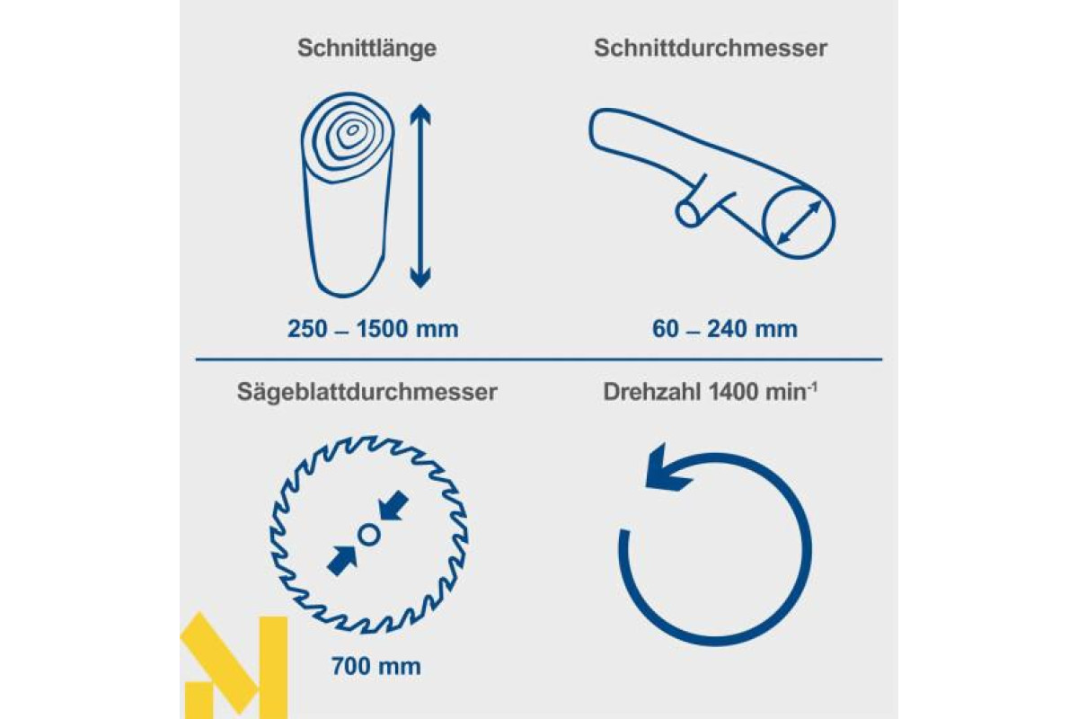 Щоб запобігти небажаному обертанню деревини під час розпилювання, супорт заготовки оснащений зубцями. Можлива довжина різу коливається від 250 до 1500 мм, а максимальний діаметр різу становить 240 мм.