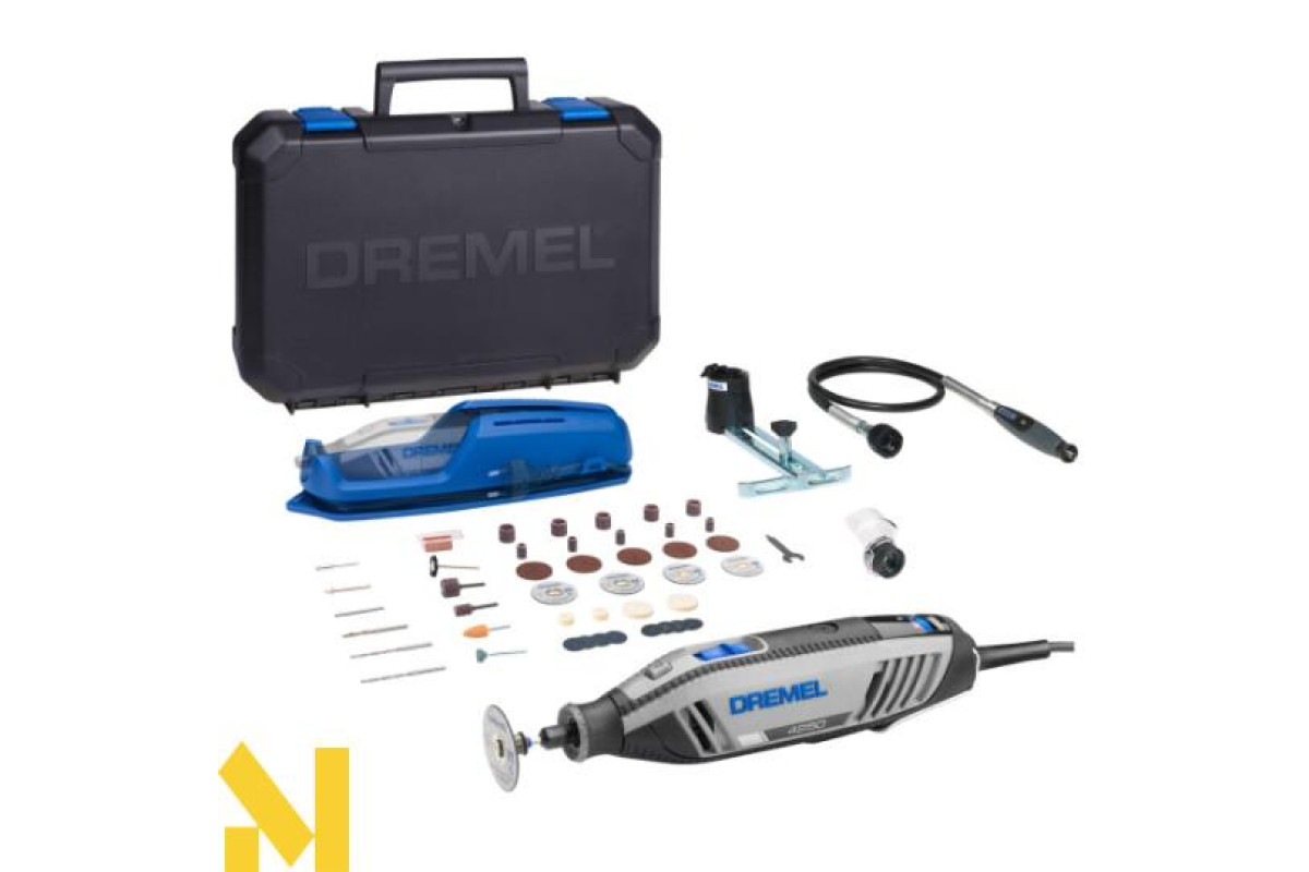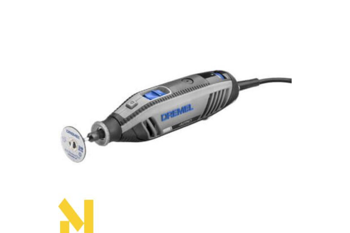 Dremel 4250-3-45 — багатофункціональний інструмент для виконання найбільш сміливих і творчих проєктів. Потужність мережевого пристрою становить 175 Вт. Кількість обертів налаштовується регулятором у діапазоні 5000-35000 об/хв. Велика кількість приставок (3 шт) і насадок (45 шт) розширюють сферу застосування інструмента. Ним можна відрізати, зачистити, відшліфувати деталі з деревини, металу, пластику тощо. Для швидкої заміни оснастки гайковий ключ вмонтований у наконечник EZ Twist. Загальна довжина 0.6-кілограмового інструмента — 23 см. Доставляється у розширеній комплектації в кейсі: