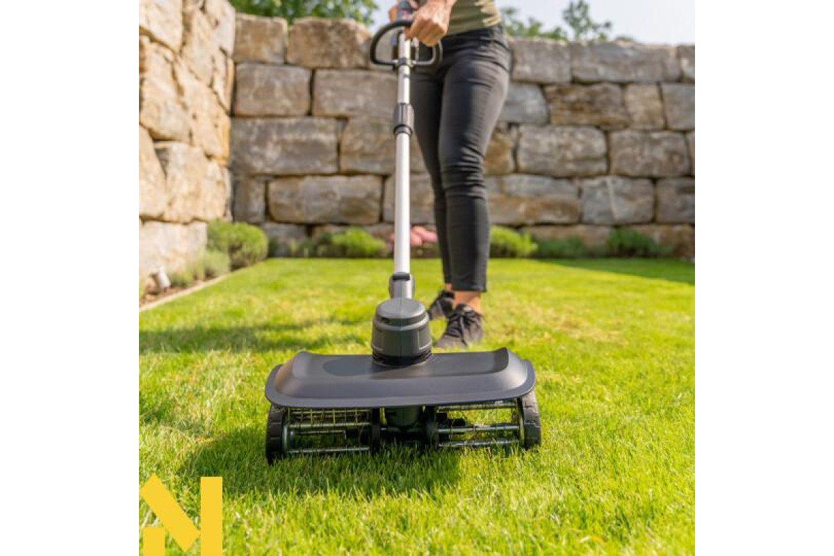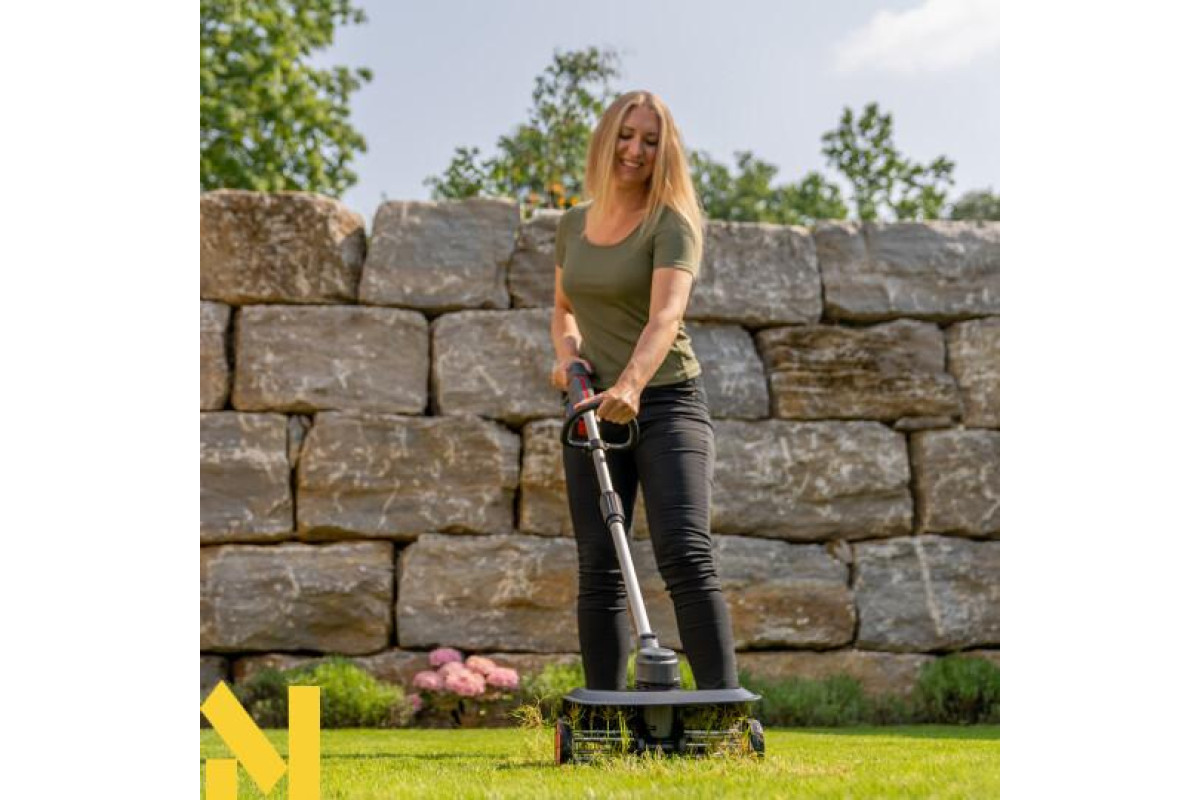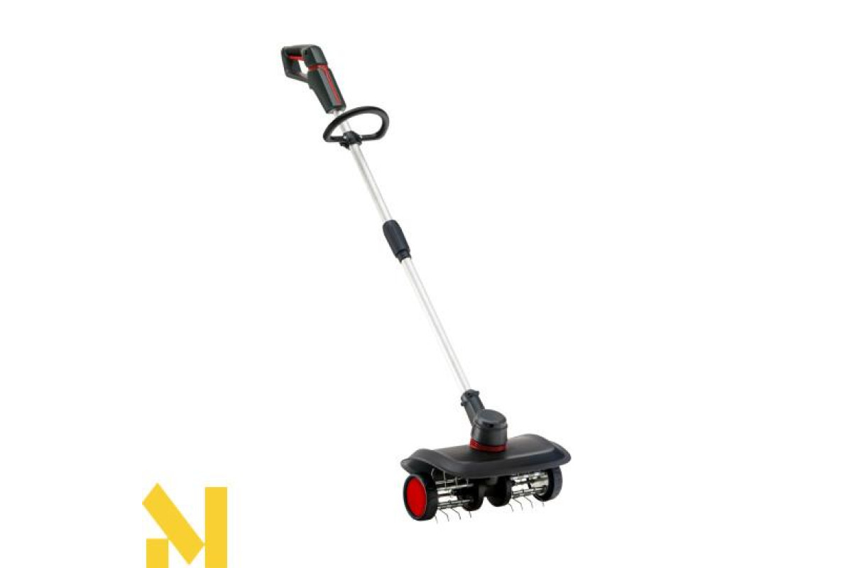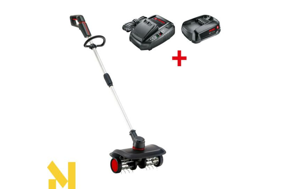 Цей універсальний садовий помічник має робочу ширину 350 мм і важить лише 4,8 кг (без акумулятора). Швидкість обертання становить 250 об/хв. 24 зубці із пружинної сталі забезпечують дуже ефективну роботу. М'яка на дотик ручка у поєднанні з другою круглою ручкою забезпечує комфортну роботу. Індикатор рівня заряду акумулятора інтегрований у пристрій.