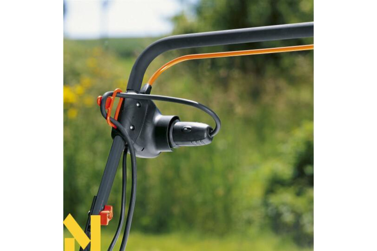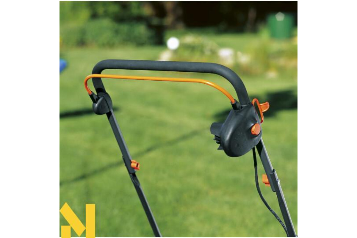 Великі колеса зі спеціальним профільним малюнком відчутно полегшують керування і забезпечують прекрасне зчеплення з поверхнею газону. Для полегшення роботи рукоятка забезпечена зручним вимикачем. Для перенесення до місця використання пристрій переводиться в спеціальне положення транспортування, при якому леза легко і швидко складаються.