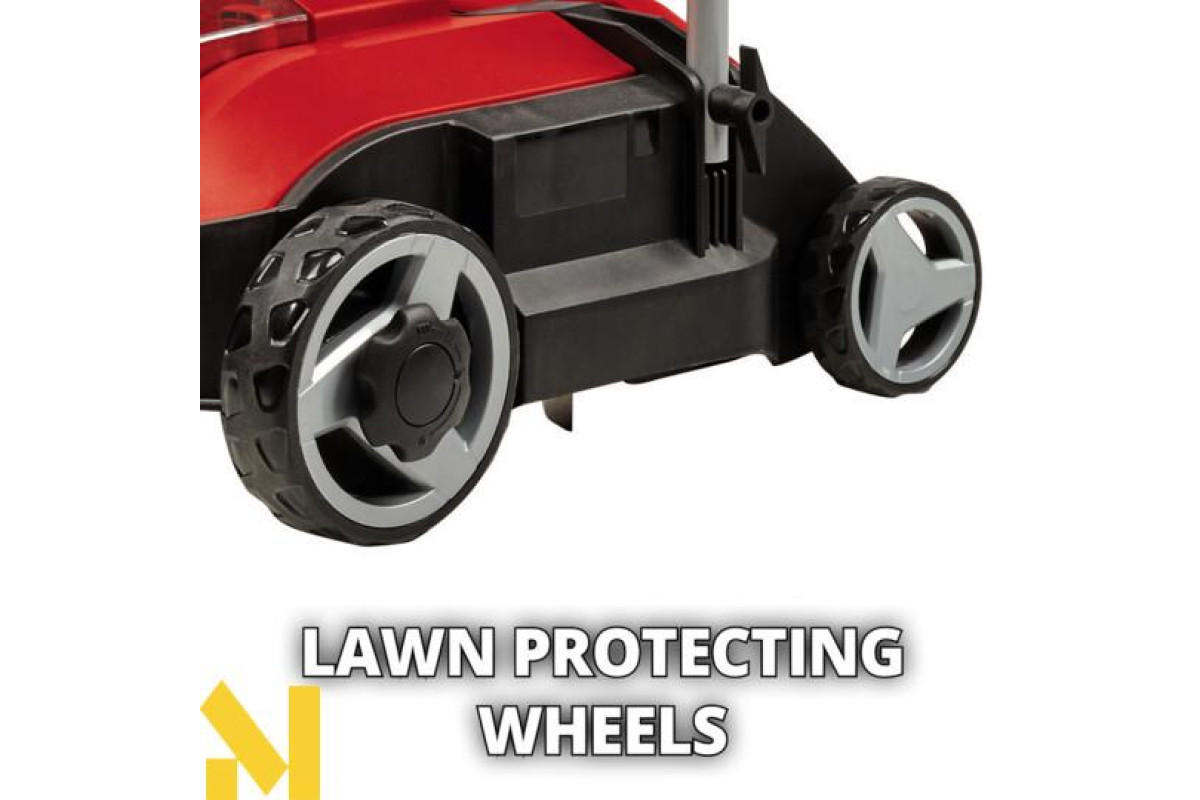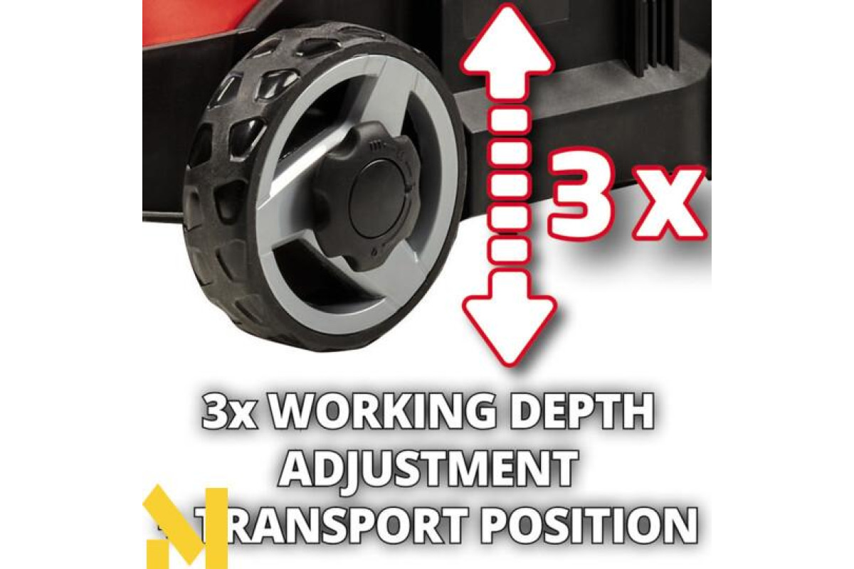 Як опція, скарифікатор доступний з роликом аератора і кошиком для трави, як комбінований інструмент 3-в-1. Шарикопідшипниковий ріжучий вузол має 12 обертових лопатей. Для зручності користувача передбачено 3 налаштування робочої глибини, положення транспортування і довгу ручку, яку можна скласти і відрегулювати за висотою. Великі колеса чинять меншу напругу на газон. Для роботи необхідна одна батарея 18 В, яка не входить до комплекту постачання.