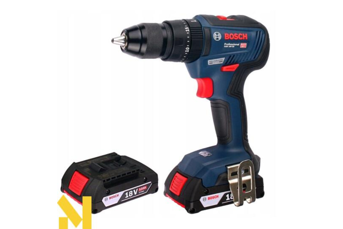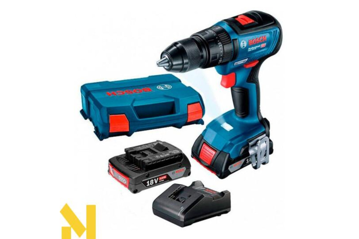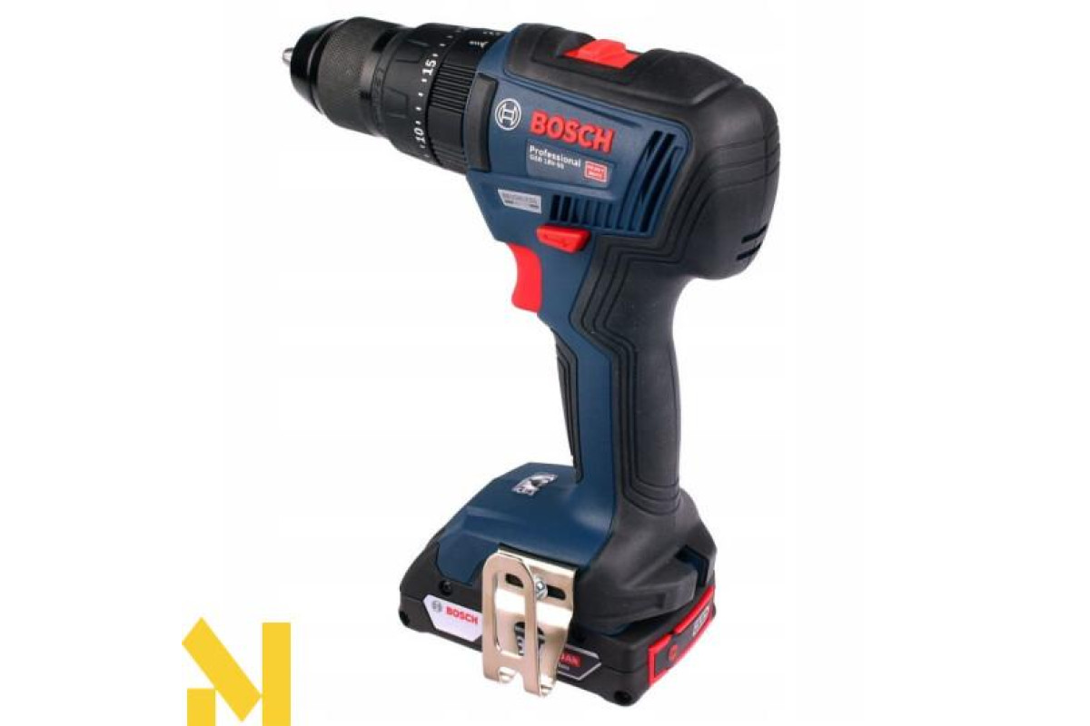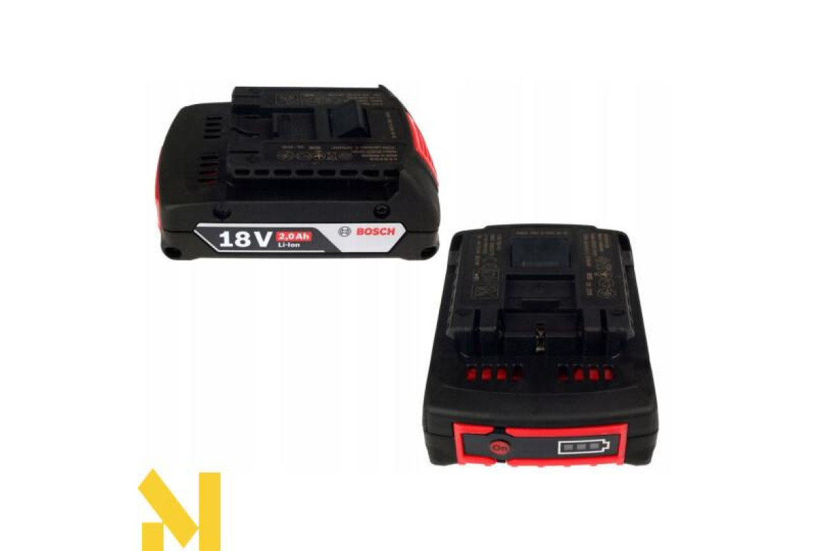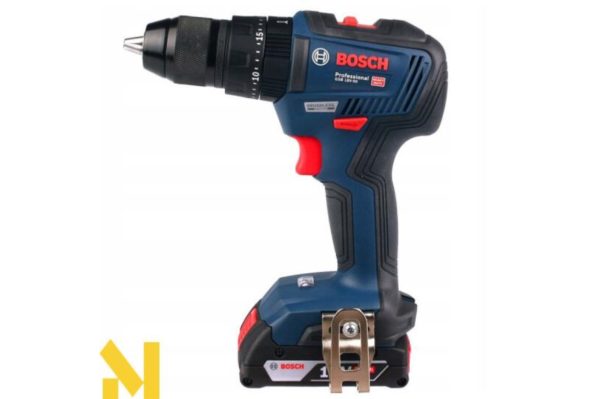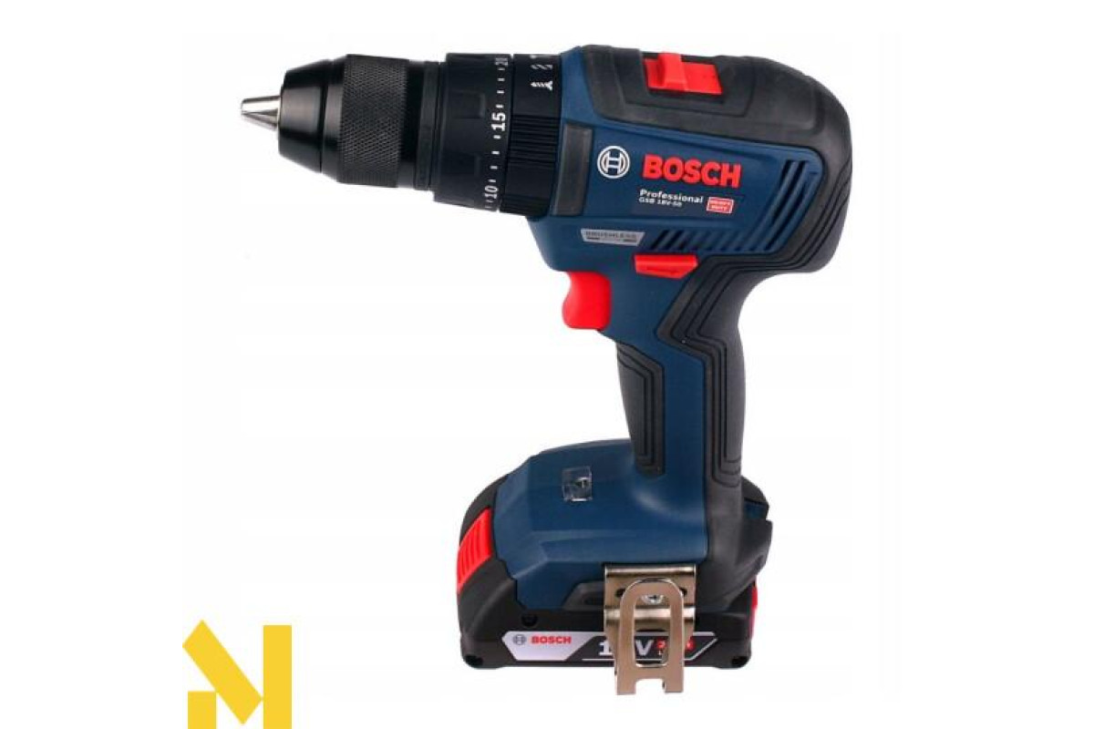 - Шуруповерт Bosch GSB 18V-50 працює на літій-іонному 18V акумуляторі. У комплект входять два акумулятори GBA 18V 2 Ah і зарядний пристрій GAL 18V-20.
