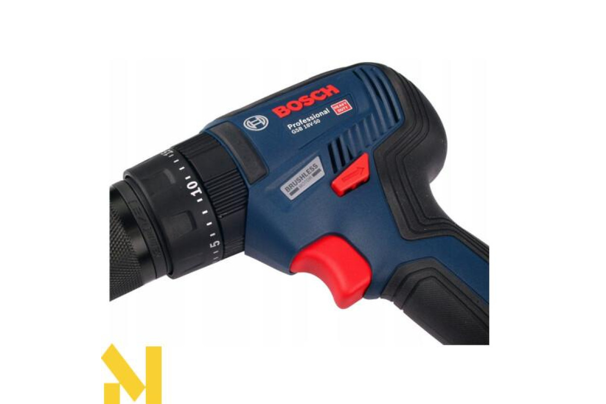 Акумуляторна дриль-шуруповерт Bosch GSB 18V-50 Professional в комплекті з двома акумуляторами GBA 18V 2 Ah і зарядним пристроєм GAL 18V-20. Двошвидкісний шуруповерт (0-460 і 0-1800 об/хв) з функцією удару (27000 уд/хв), крутний момент 50 Нм при жорсткому і 28 Нм при м'якому закручуванні, регульований 20 ступенями. Швидкозатискний патрон 1,5-13 мм. Свердлить в деревині отвори діаметром 35 мм, в цеглі і металі - 13 мм, а також в кераміці та пластмасі, закручує і відкручує шурупи максимальним діаметром 10 мм.