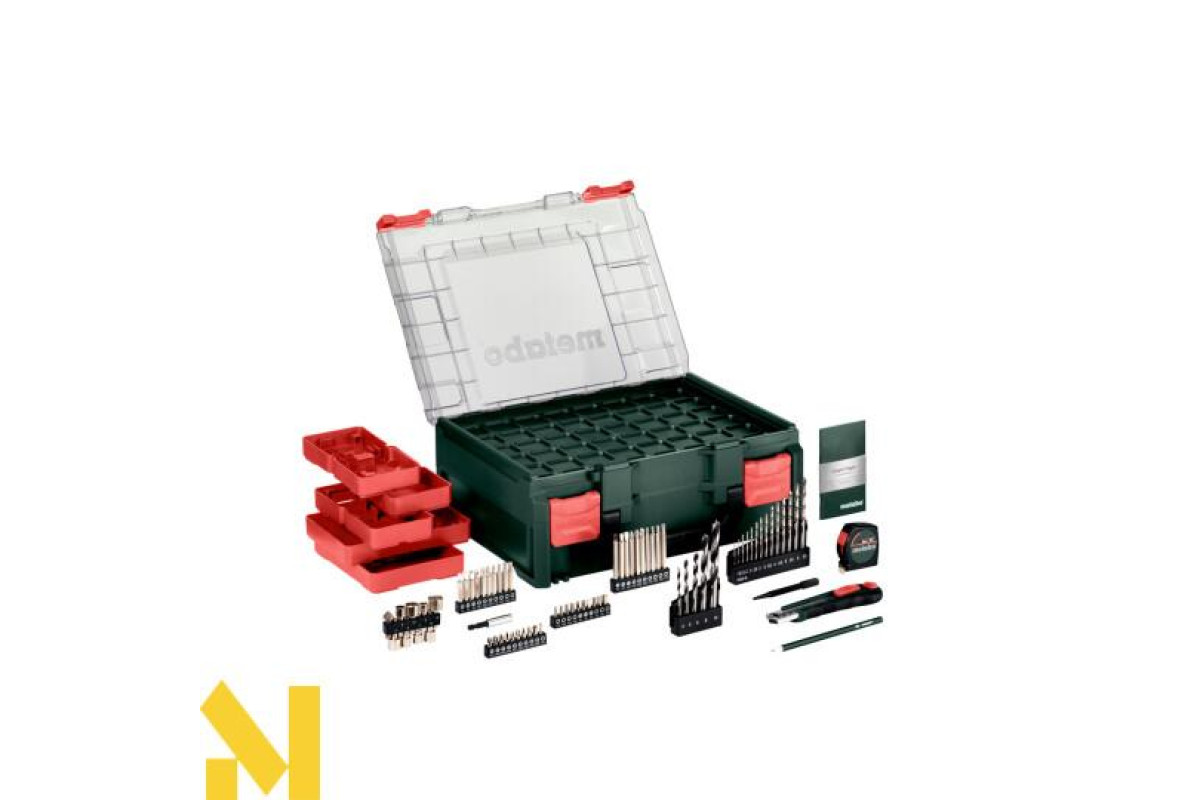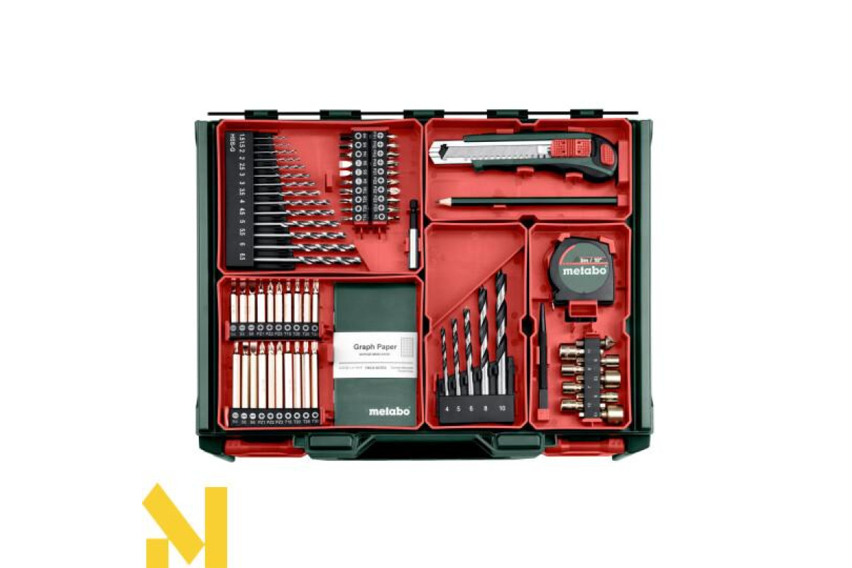 Акумуляторний дриль-шуруповерт Metabo BS 18 Quick Mobile Workshop з широким вибором приладдя, яке завжди буде під рукою у потрібну хвилину. У комплекті є рулетка, ніж, олівець, різні свердла, біти, головки тощо.