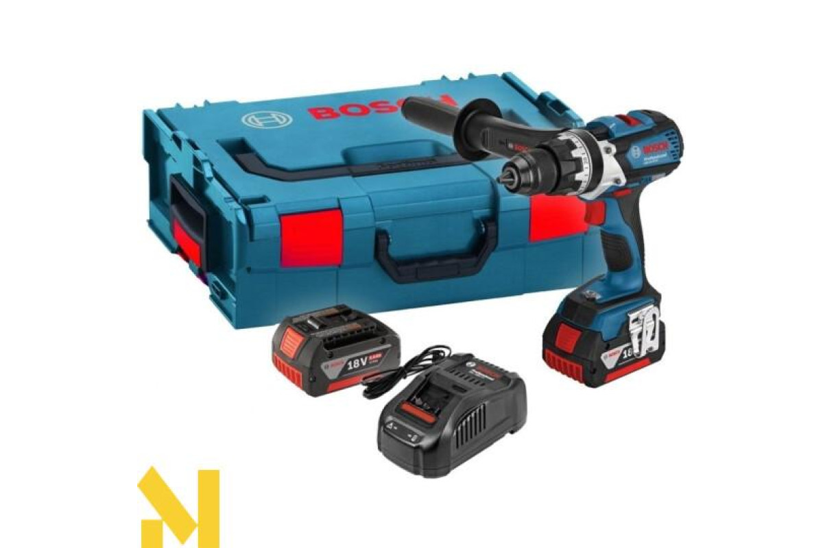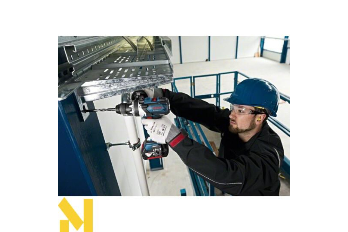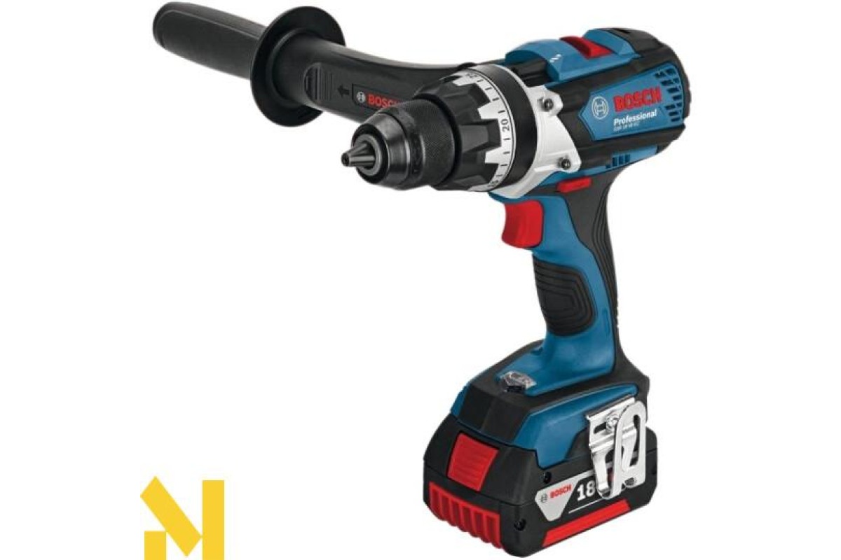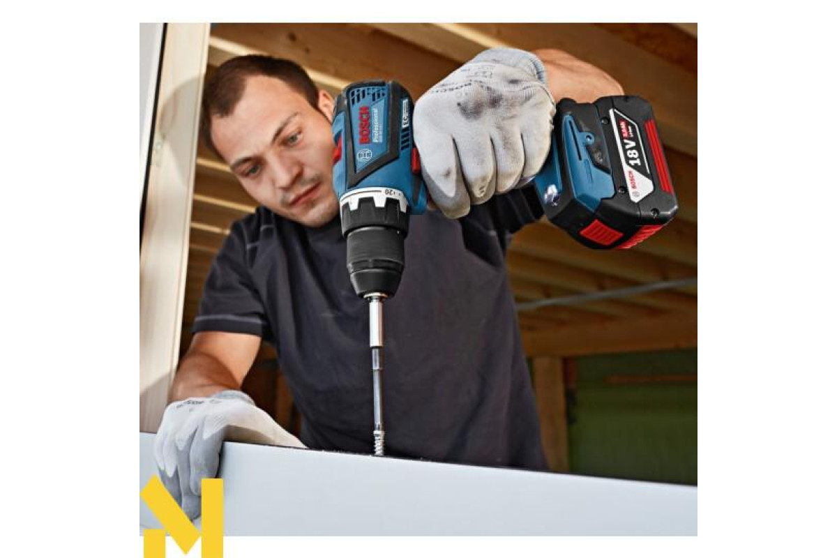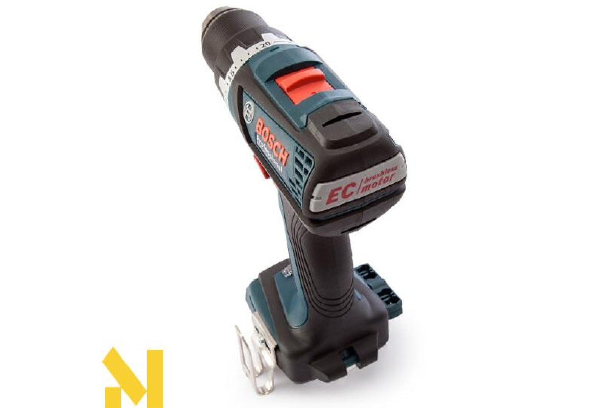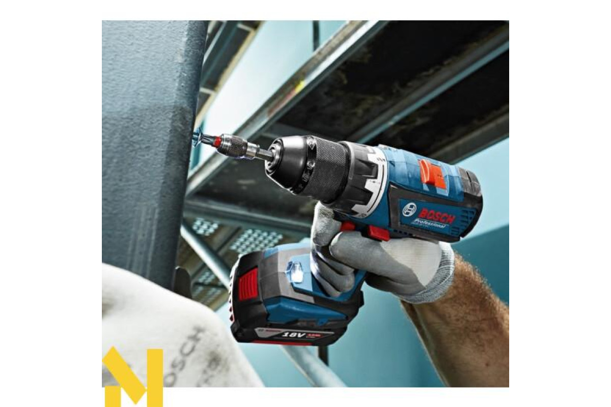 Безщітковий дриль-шуруповерт GSR 18 V-EC Professional з 18-вольтним літій-іонним акумулятором ємністю 5,0 Ач. Свердлить отвори в деревині максимум 38 мм, в сталі - 13 мм, закручує/відгвинчує шурупи діаметром до 10 мм. Загортає до 826 шурупів на одному заряді. Регульований крутний момент з максимальним значенням 50 Нм при жорсткому і 31 Нм при м'якому загвинчування. Безщітковий двигун EC motor.