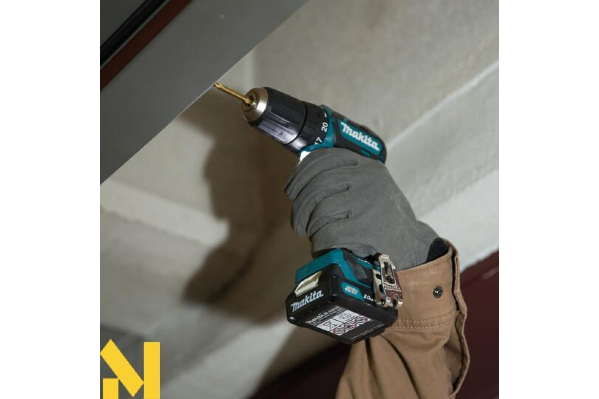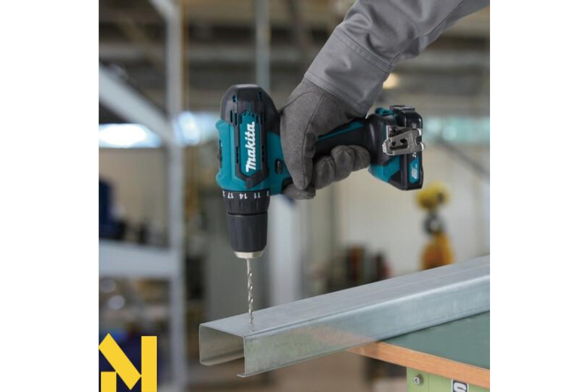 Дриль-шуруповерт Makita DF333DWAE дозволяє затягнути і витягнути кріплення, просвердлити отвір в металах і дереві. Працездатність забезпечує літій-іонний акумулятор 10,8 або 12 В серії CXT. Такий тип акумуляторів захищений від саморозряду, не має ефекту пам'яті. Можна зарядити при будь-якому рівні залишкового заряду. Дві робочі швидкості дозволяють працювати з м'якими і твердими матеріалами. На першій передачі здійснює до 450 оборотів в хвилину. На другий робить до 1700 об/хв. Крутний момент при м'якому закручуванні 14 Нм, при жорсткому 30 Нм. Крутний момент має 18 ступенів регулювання. Швидкозатискний патрон з блокується шпинделем дозволяє легко міняти оснастку. Можна зафіксувати приналежність з діаметром хвостовика від 0,8 до 10 мм. Дозволяє зробити отвір в металі 10 мм, в дереві 21 мм. Додатково освітить зону роботи інтегрований світлодіод. Рукоятка з гумовими накладками комфортно лежить в руці, не ковзає в процесі роботи.