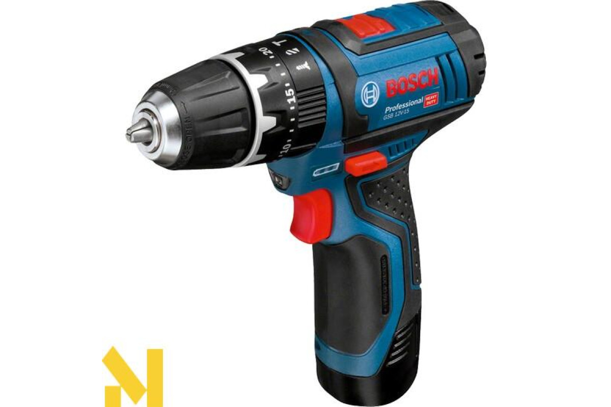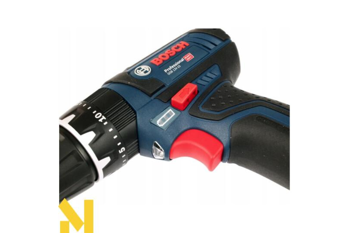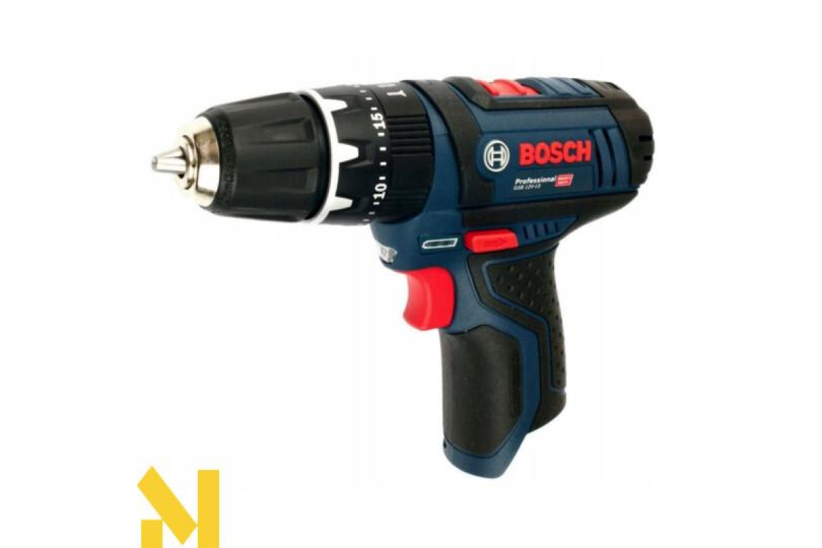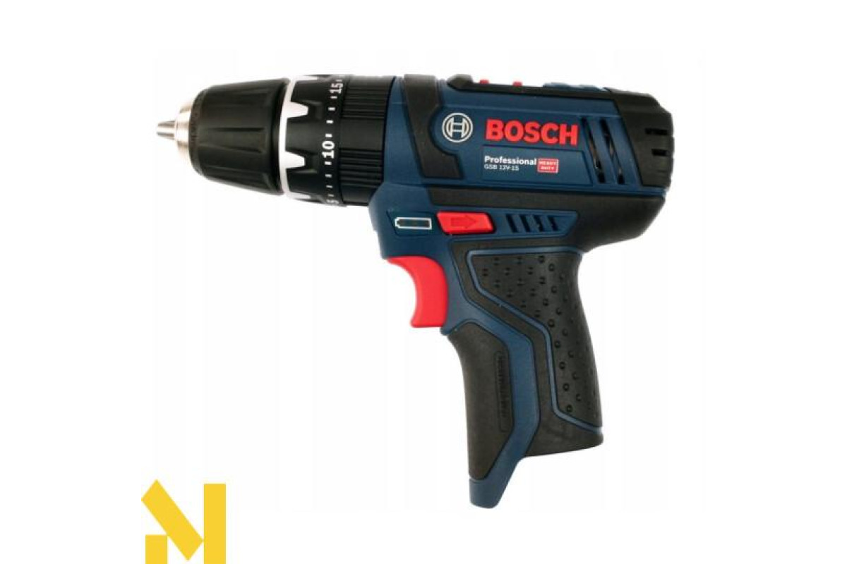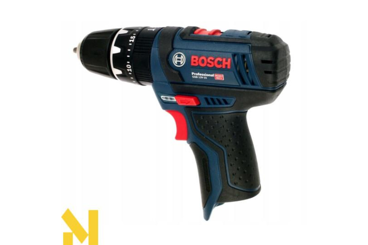 Бездротова дриль-шуруповерт Bosch GSB 12V-15 ударної дії (19500 уд/хв) виконує отвори в цеглі та камені (діаметром до 10 мм), в деревині (19 мм), металі (10 мм), кераміці. Закручує і відкручує кріплення (7 мм). Дві швидкості (0-380 об/хв і 0-1300 об/хв). Настроюється 20 ступенями момент затяжки 30 Нм / 13 Нм. Реверс. Швидкозатискний патрон Auto-Lock 10 мм. Шпиндель ½ дюйма. У дію приводиться літій-іонним 12 або 10,8 В акумулятором серії GBA 10,8 В.