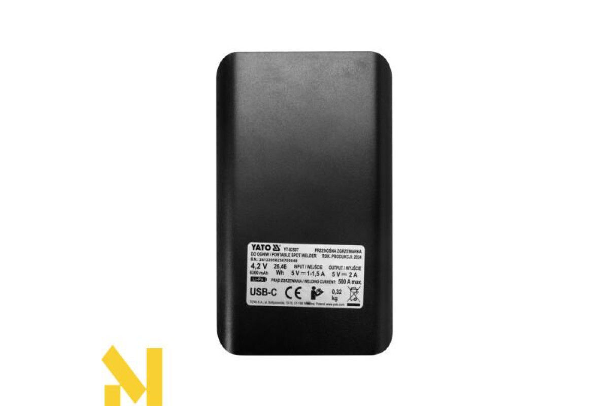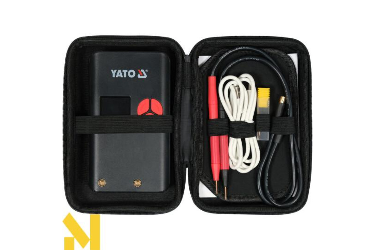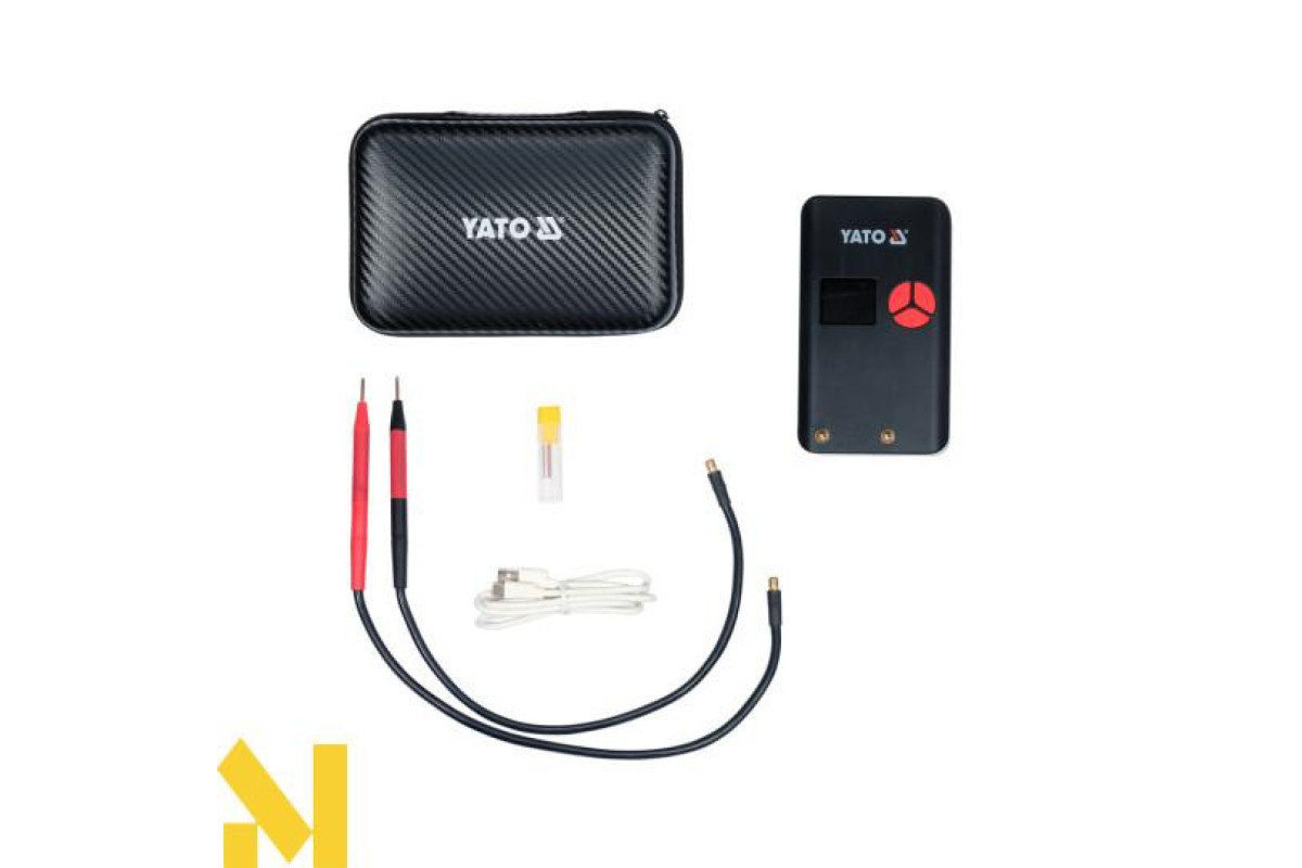 Апарат забезпечує максимальний зварювальний струм ~500 А. Це середнє реальне значення струму, виміряного за період 100 мс. Деякі виробники надають поточні параметри МОП-транзисторів або значення пікового струму замість фактичного зварювального струму. З точки зору технічних даних це вірно, але на практиці часто неможливо отримати належний зварний шов, використовуючи нікельовану стрічку товщиною 0,15 мм. Портативний апарат точкового зварювання YATO дозволяє виконувати правильні зварні шви за допомогою нікельованих стрічок шириною 8 мм і товщиною 0,20 мм і нікелевих стрічок шириною 8 мм і товщиною 0,15 мм.