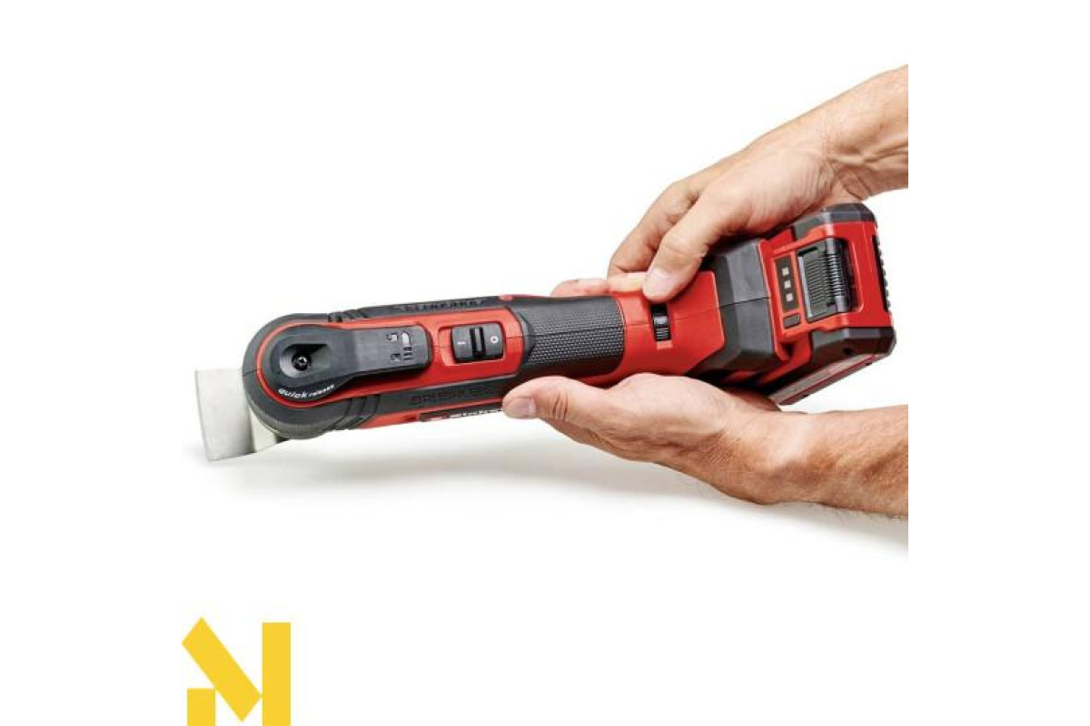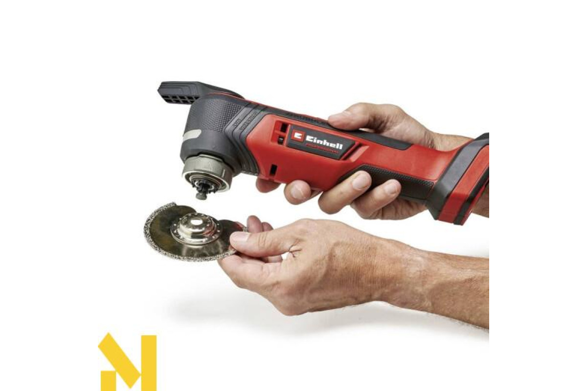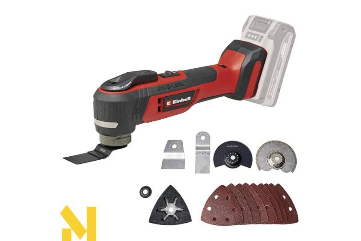 Акумуляторний багатофункціональний інструмент Einhell Professional TP-MG 18 Li BL-Solo неймовірно універсальний. Будучи частиною сімейства Power X-Change, він може поєднується з усіма системними акумуляторами і зарядними пристроями цього сімейства. Інструмент приводиться в дію безщітковим двигуном PurePOWER, що забезпечує підвищену потужність і тривалий час роботи. Зміна приладдя без використання інструментів можлива завдяки швидкознімному кріпленню та магнітному тримачу. Регулювання швидкості, світлодіодне підсвічування, вібропоглинаюча головка і м'яка рукоятка забезпечують безпеку роботи. До комплекту входять дельтаподібний шліфувальний черевик, 9x наждачних паперів, скребок, заглибні та сегментні пиляльні полотна. Акумулятор і зарядний пристрій не входять до комплекту поставки і купуються окремо.