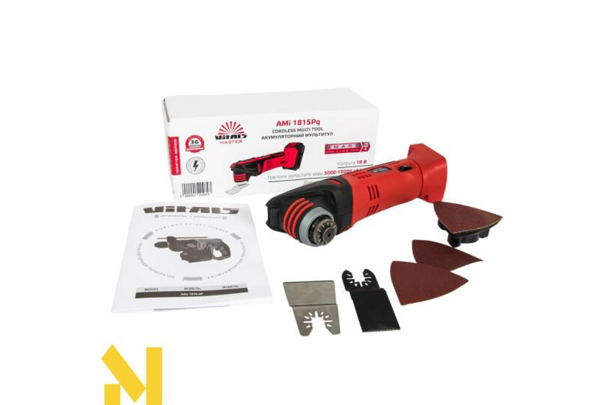 Мультитул акумуляторний Vitals Master AMi 1815Pq поставляється з комплектом аксесуарів – набір пильних полотен, комплект шліфувального паперу, дельташліфпластіна. Тому придбавши інструмент, ви відразу можете приступати до виконання необхідних робіт.