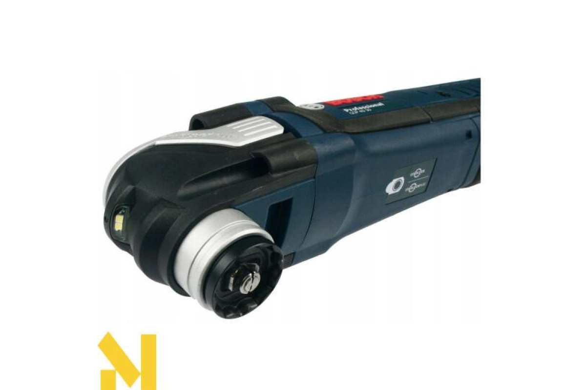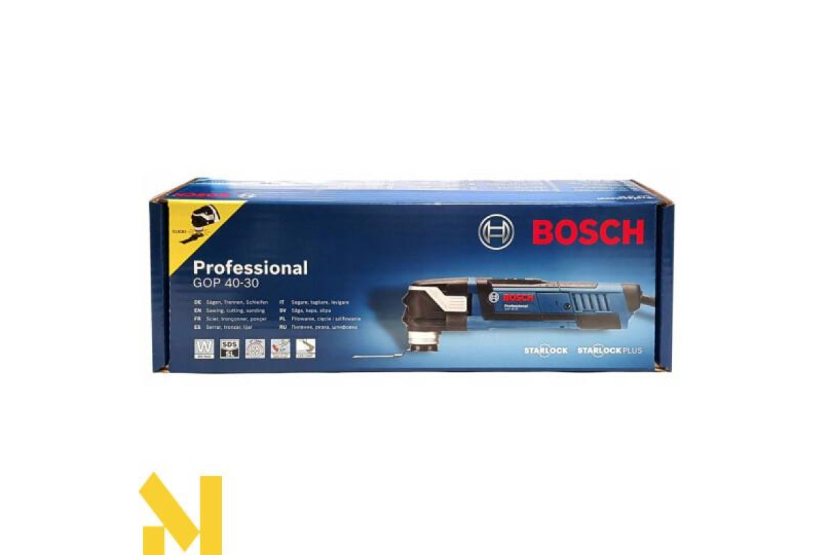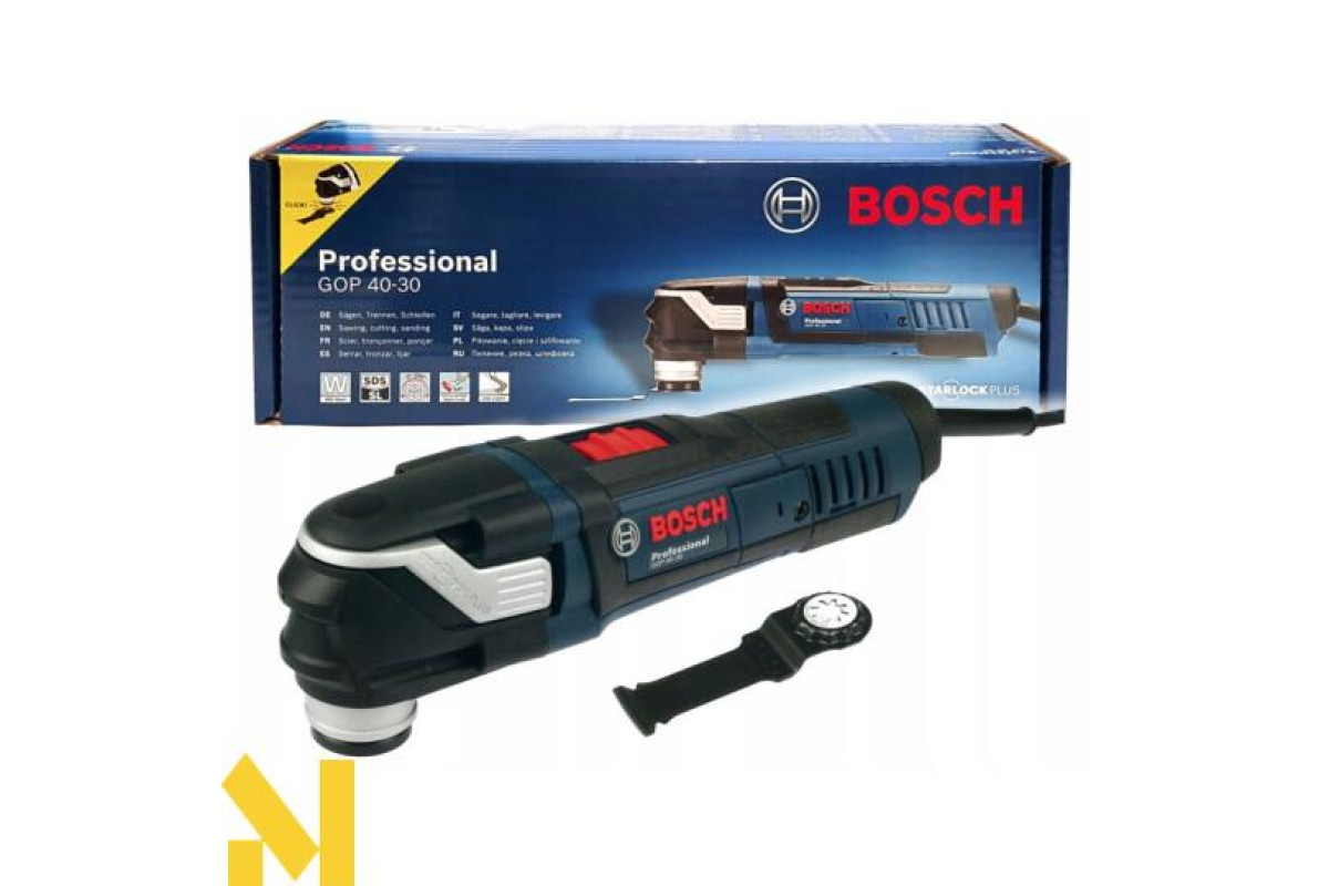 Універсальний Multi-Cutter Bosch GOP 40-30 Professional потужністю 400 Вт з регульованою від 8000 до 20000 частотою коливань. Кут качання вліво / вправо 1,5 °. Пиляє, ріже дерев'яні матеріали, пластик, кольорові метали, гіпс, шліфує і Шабр невеликі поверхні, обробляє м'яку плитку. Зручний для обробки урівень, поблизу краю. Кріплення насадок Starlock Plus. Пиловідсмоктувальної пристрій. Функція Snap In для заміни приладдя за три секунди.