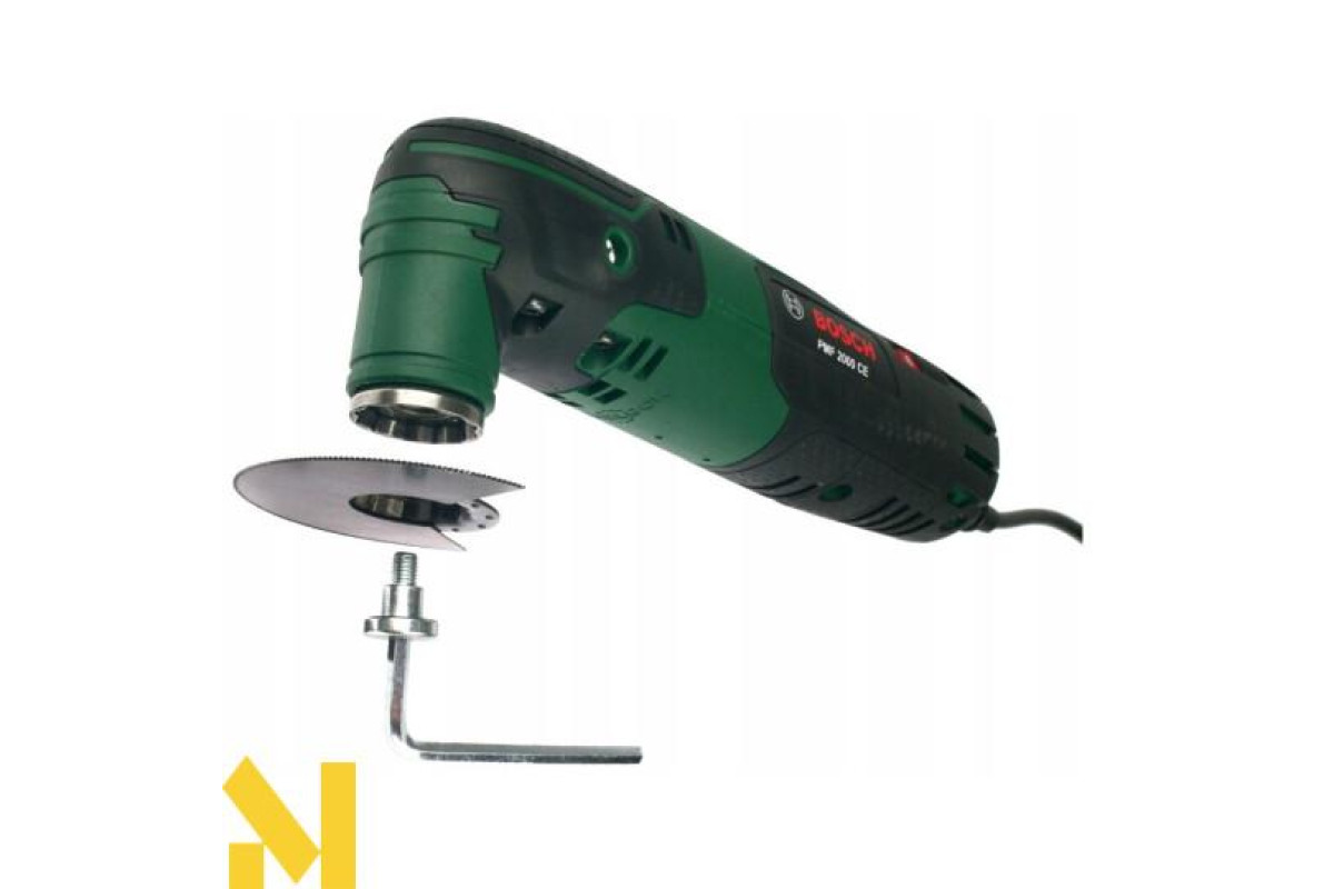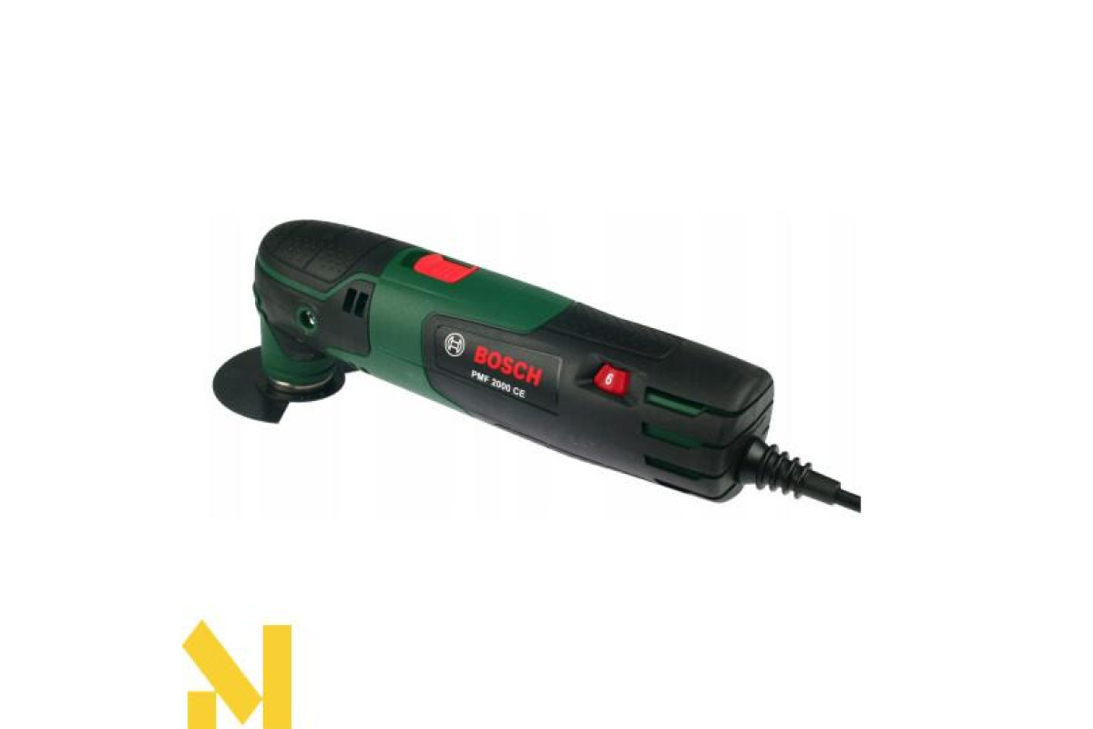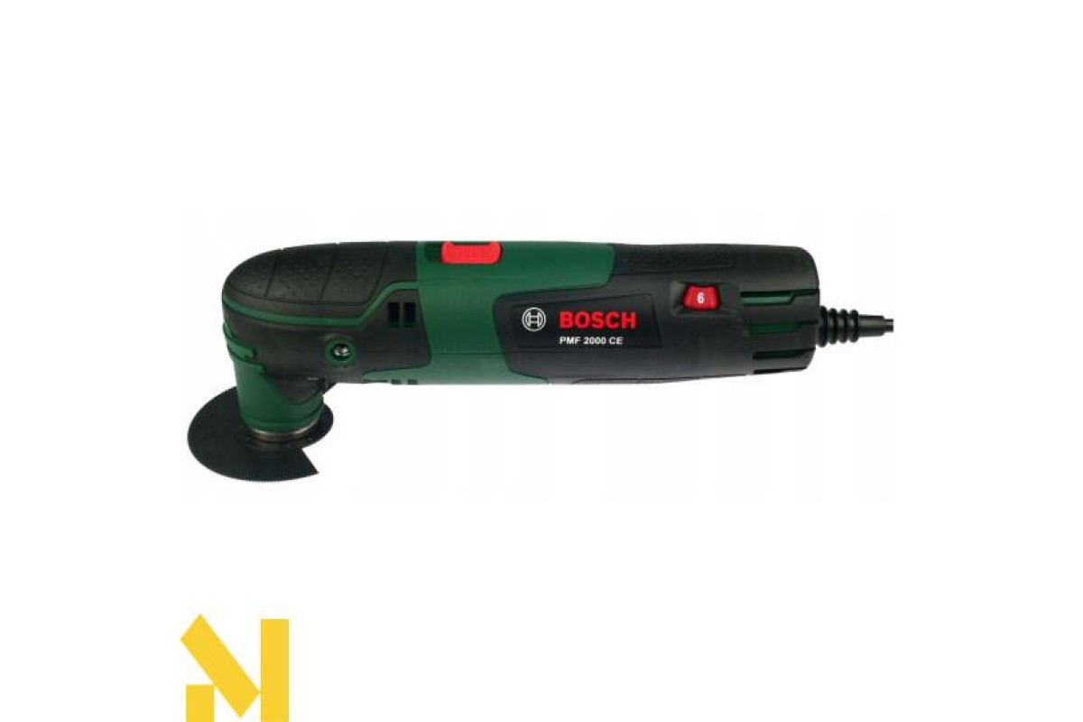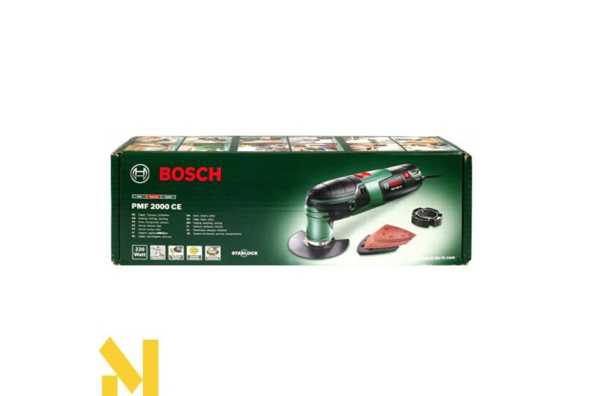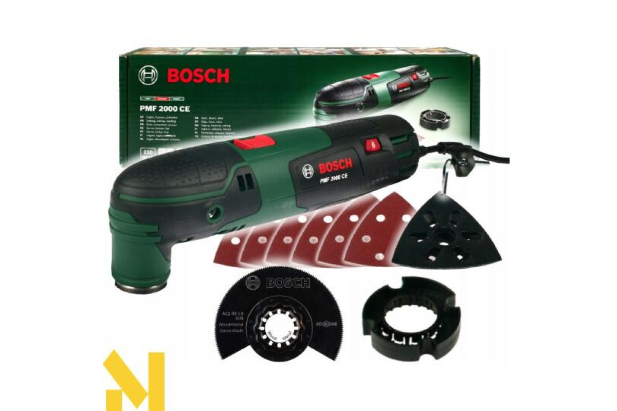 Мультиінструмент Bosch PMF 2000 CE потужністю 220 В з настроюватися і утримуваної електронним стабілізатором частотою ходів (від 15000 до 20000 хід/хв), кутом коливань зліва/справа 2,8 градуса. Магнітний патрон з універсальним гвинтом для простої переустановки аксесуарів з кріпленням Starlock. 4-рівневий обмежувач глибини. Поставляється в картонній упаковці з сегментованим пильним диском, набором дельташліфлістов, дельташліфпластіной.
