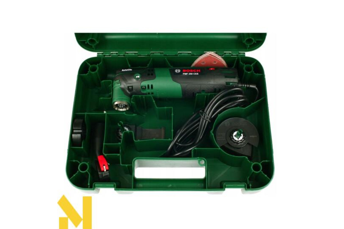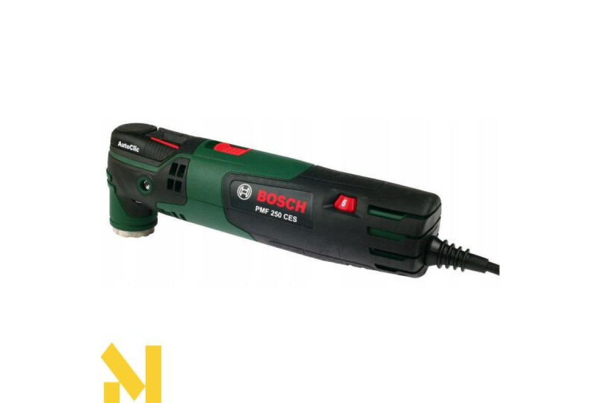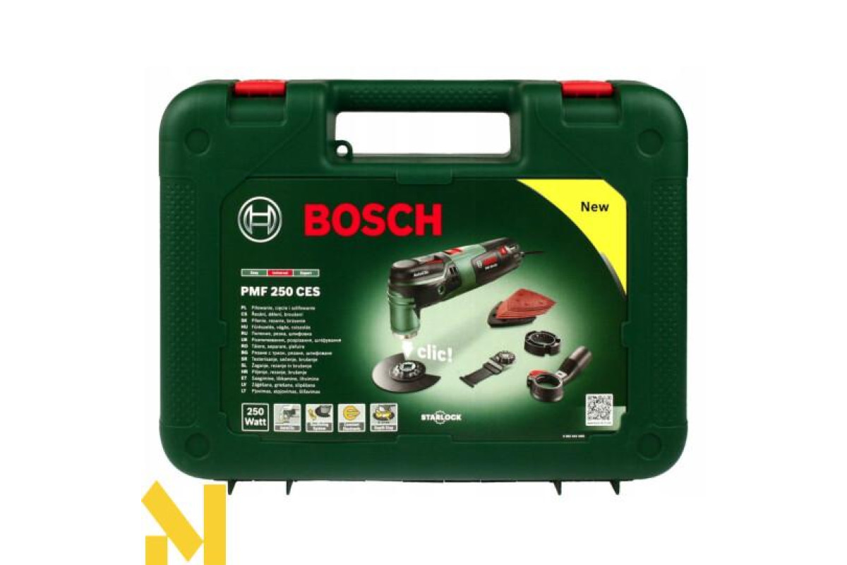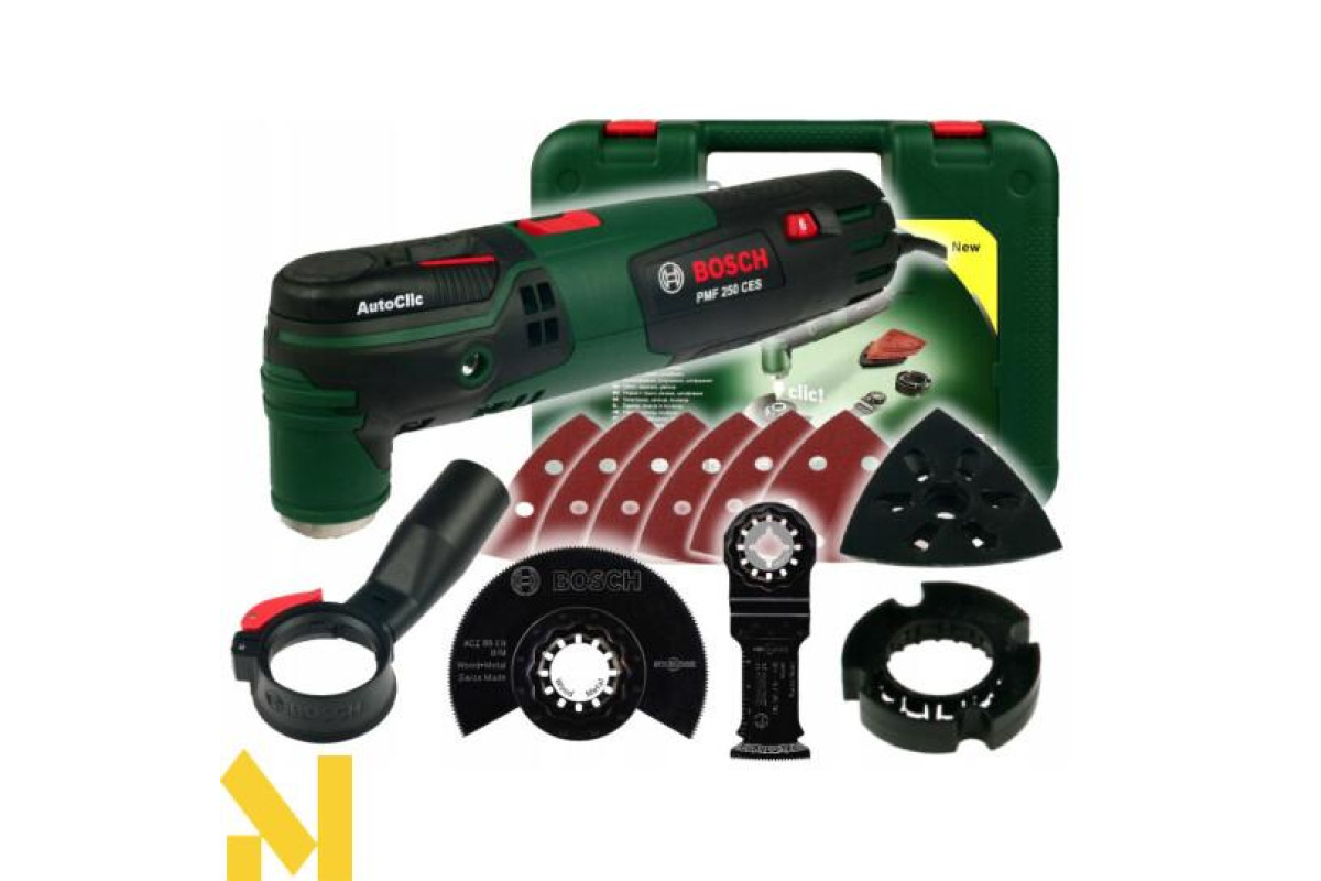 Різання, фрезерування, зачистку, шліфування, полірування будь-яких матеріалів виконує 250-ватний мультитул Bosch PMF 250 CES. 6-ступінчаста настройка числа обертів від 15000 до 20000 об/хв. Електронний стабілізатор. Кут коливань вліво-вправо 2,8°. AutoClic для безінструментального міняти приладдя за 3 секунди. Тримач Starlock дозволяє використовувати різні насадки. Можливість підключення пилососа. Універсальний інструмент поставляється в пластмасовому валізі з адаптером для видалення пилу, 4-ступінчастим обмежувачем глибини, сегментованим направляючою шиною по дереву і металу 85 мм ACZ 85 EB, набором шліфлистів, шліфпластина 93 мм АВЗ 93 G, направляючою шиною по дереву.
