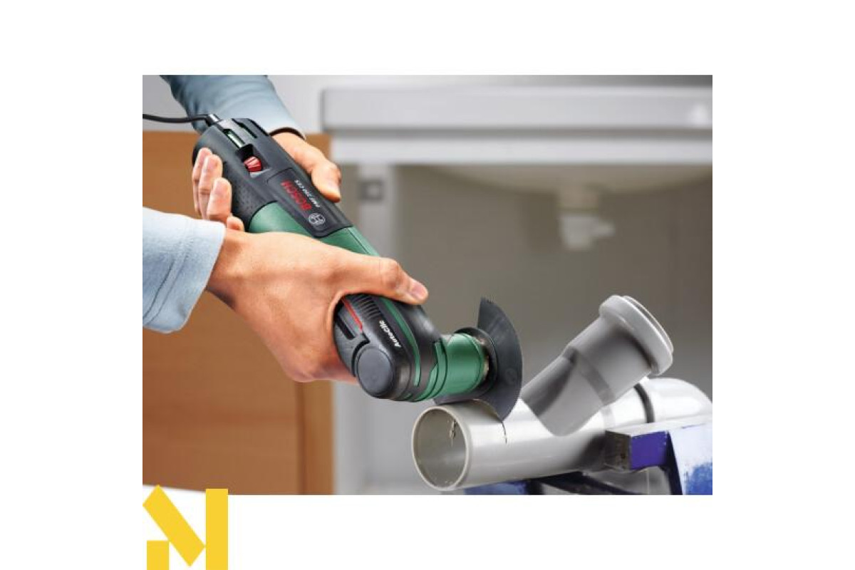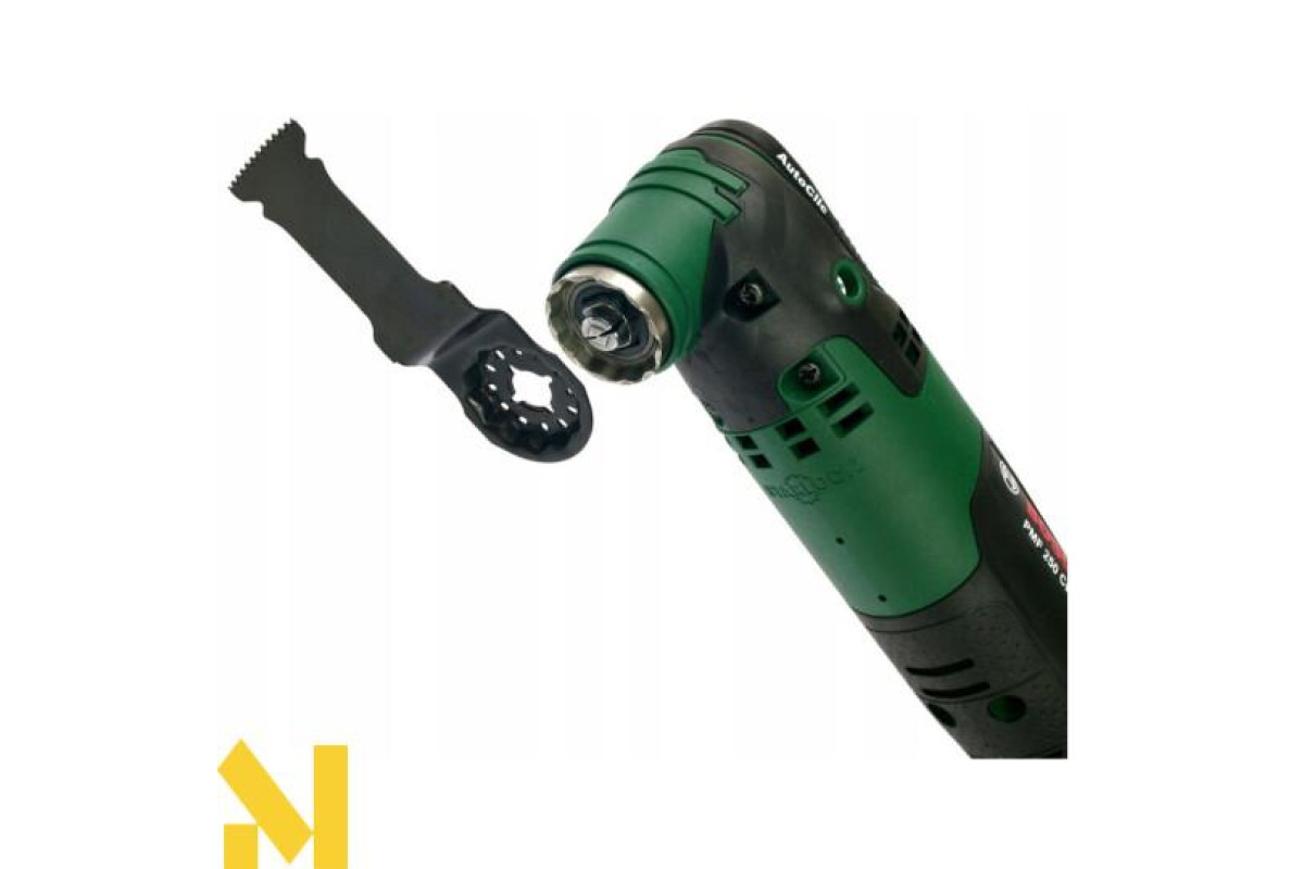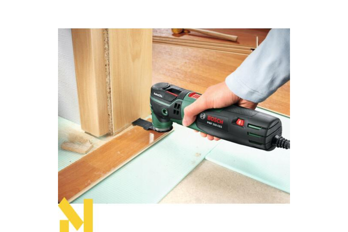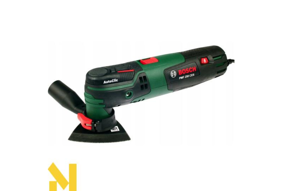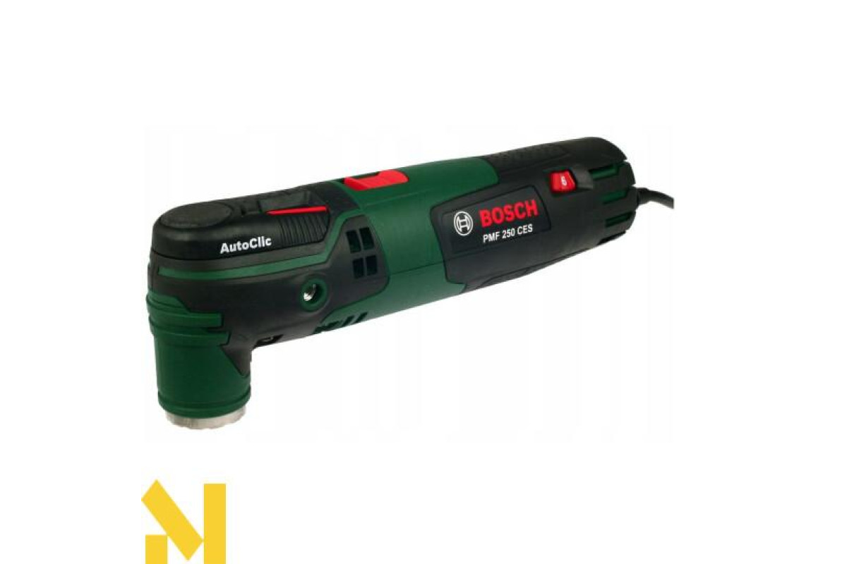Різання, фрезерування, зачистку, шліфування, полірування будь-яких матеріалів виконує 250-ватний мультитул Bosch PMF 250 CES. 6-ступінчаста настройка числа обертів від 15000 до 20000 об/хв. Електронний стабілізатор. Кут коливань вліво-вправо 2,8°. AutoClic для безінструментального міняти приладдя за 3 секунди. Тримач Starlock дозволяє використовувати різні насадки. Можливість підключення пилососа. Універсальний інструмент поставляється в пластмасовому валізі з адаптером для видалення пилу, 4-ступінчастим обмежувачем глибини, сегментованим направляючою шиною по дереву і металу 85 мм ACZ 85 EB, набором шліфлистів, шліфпластина 93 мм АВЗ 93 G, направляючою шиною по дереву.