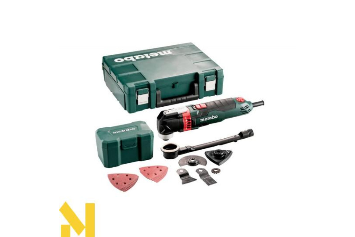 Мультиінструмент Metabo MT 400 Quick Set розширена комплектація мережевого мультитула Metabo MT 400 Quick. На відміну, від класичної версії, в цю комплектацію входить добротний набір насадок, а сам інструмент йде не в картонній коробці, а пластиковому кейсі.