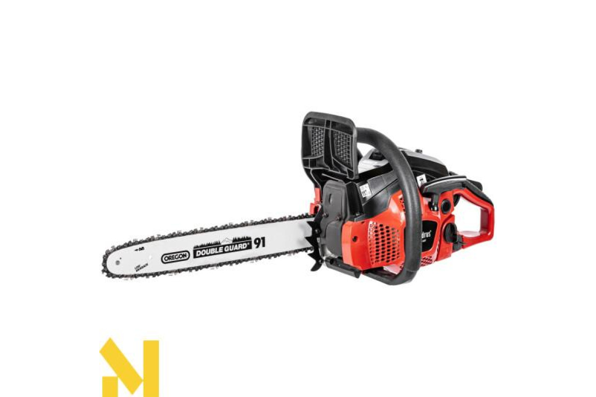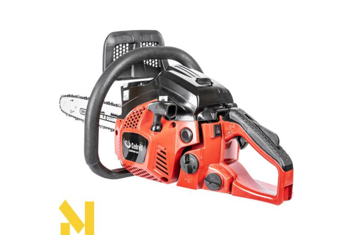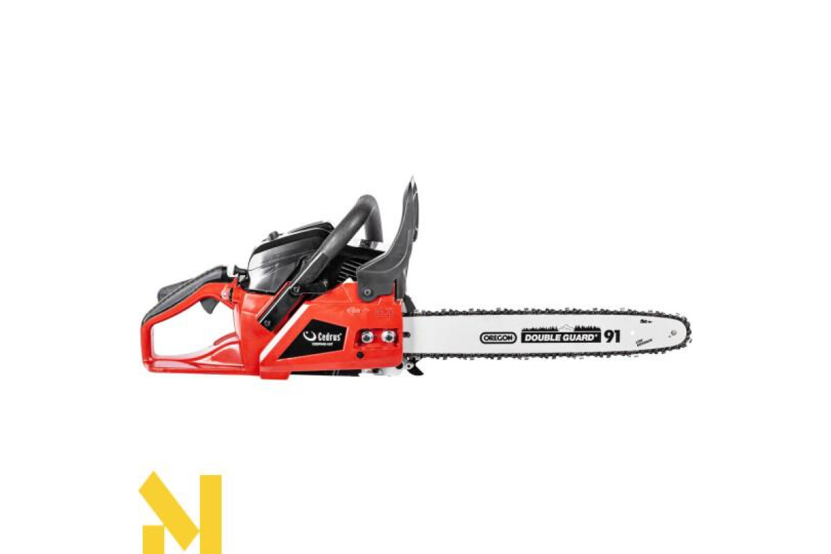 Бензинова бензопила CEDRUS PS40-16T для заготівлі дров, обрізки гілок в саду або догляду за деревами в лісі. Оснащена надійним двотактним двигуном об'ємом 40,1 см³, шиною та ланцюгом OREGON. Спеціальна амортизація ізолює ручку від двигуна, щоб мінімізувати надмірну вібрацію від роботи двигуна.