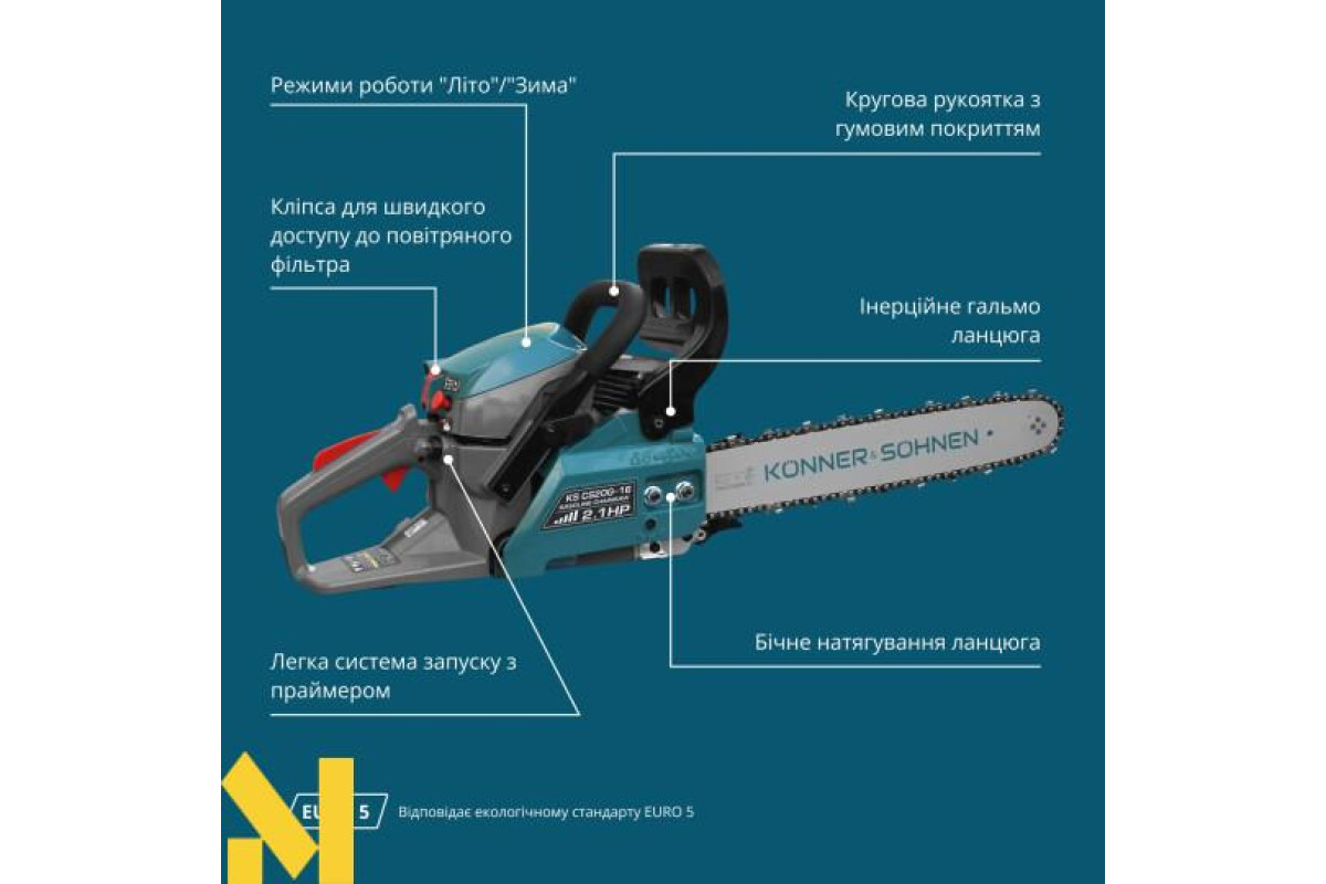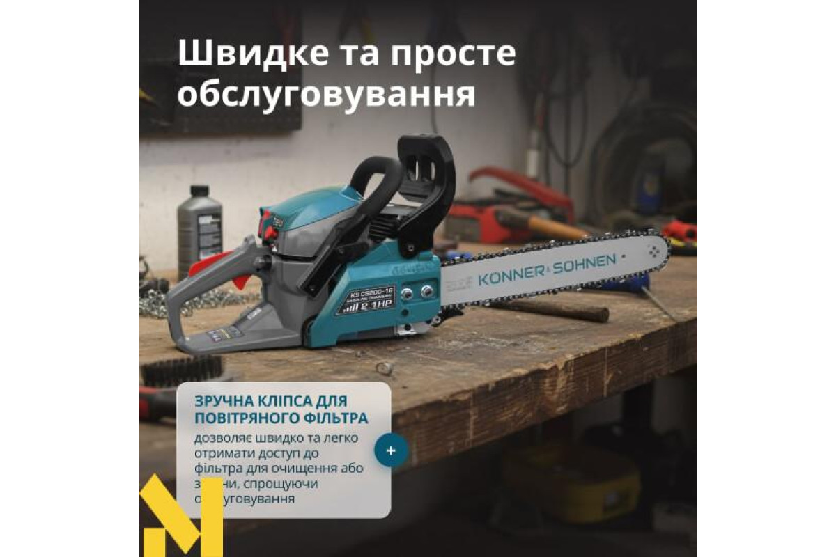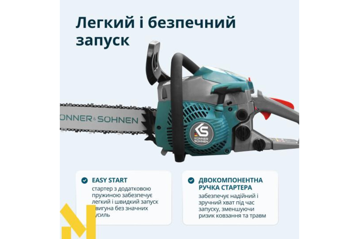 Бензопила Könner & Söhnen® KS CS20G-16 поєднує продуктивність, надійність і комфорт у використанні. Надійний двигун забезпечує ефективне спалювання пального, знижує витрату та підвищує потужність. Режим захищає карбюратор від заледеніння. Безпеку гарантує інерційне гальмо ланцюга, зубчастий упор, уловлювач ланцюга та клавіша блокування курка дросельної заслінки, а легкий запуск забезпечують EASY START, праймер і автоматична кнопка STOP. Бічне натягування ланцюга, швидкий доступ до фільтра та ергономічна кругова рукоятка з гумовим покриттям роблять роботу комфортною навіть під час тривалого використання^