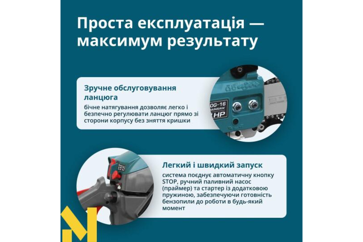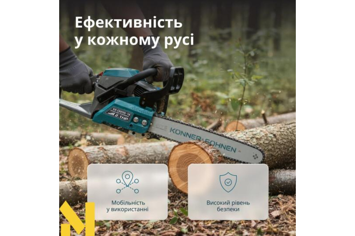 Потужність забезпечує оптимальне поєднання сили та зручності у використанні. Пила легко справляється з обрізкою дерев, заготівлею дров та іншими господарськими завданнями.