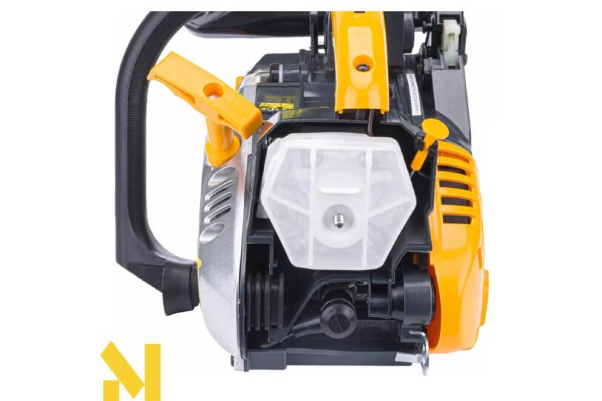 Пила оснащена антивібраційною функцією, аварійним гальмом, муфтою і автоматичним змащенням ланцюга.