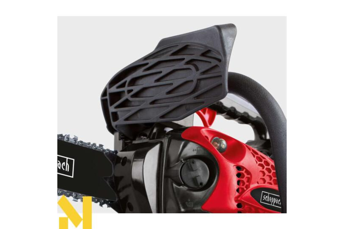 Ще важливішими за високий рівень комфорту є вбудовані механізми безпеки. Великий металевий кігтеподібний обмежувач дозволяє закріпити блок двигуна на деревині під час пиляння з обкатканим ланцюгом. Це запобігає неконтрольованому розгойдуванню бензопили. Він також дозволяє використовувати важіль для тиску на пильний ланцюг. У разі віддачі гальмо ланцюга зупиняється за мілісекунди.