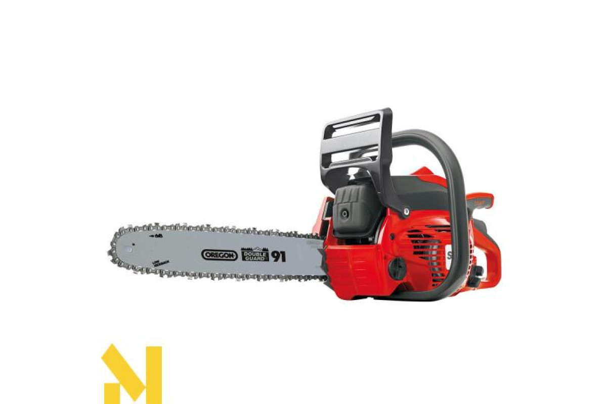 Довговічна, оригінальна пильна шина "Oregon" з шириною різу 40 см дозволить вам виконувати роботу швидко і і ефективно, при хорошій маневреності та й зручній маніпуляції. Ланцюг 3/8 "марки" Oregon "оснащена швидконатяжним пристроєм, щоб можна було без додаткових інструментів натягнути або замінити її, а також легко і просто налаштувати мастило ланцюга. Під потреби користувача налаштовані такі можливості, як заміна повітряного фільтра вручну без інструментів, просте відкриття бензобака і маслобака, що тільки підкреслює простоту технічного обслуговування і практичного застосування приладу. Бензиновий двигун потужністю 2,3 кінських сил з робочим об'ємом 42,2 куб. см. дуже легко запускається завдяки праймеру і системі плавного запуску. Питома вага на одиницю потужності становить 2,5 кг/кВт. Завдяки додатковому придушенню вібрацій і наявності рукояток з оптимізованою ергономікою, вся міць маловібраційного перекладу передається на шину та ланцюг, щоб полегшити вам отримання точних результатів різання в режимі, одночасно щадному для суглобів Вашої кисті. Ще один плюс: великий фільтр з нетканого матеріалу можна замінити без застосування інструментів. Корпус дуже стійкий до навантажень і гарантує довгий термін служби.