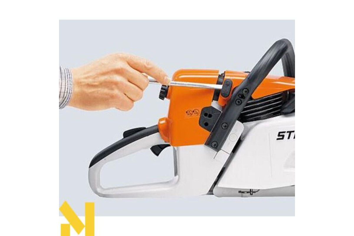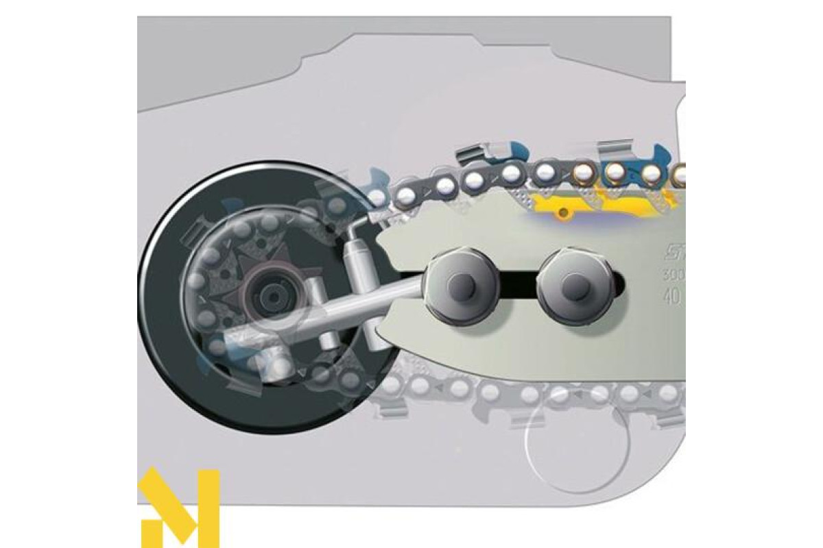 Система швидкого натягування ланцюга STIHL (B) натягування ланцюга відбувається одним пальцем. Достатньо ослабити гайку кріплення кришки ланцюгової зірочки і за допомогою колеса легко та швидко натягнути ланцюг. Ключ для цього не потрібен.