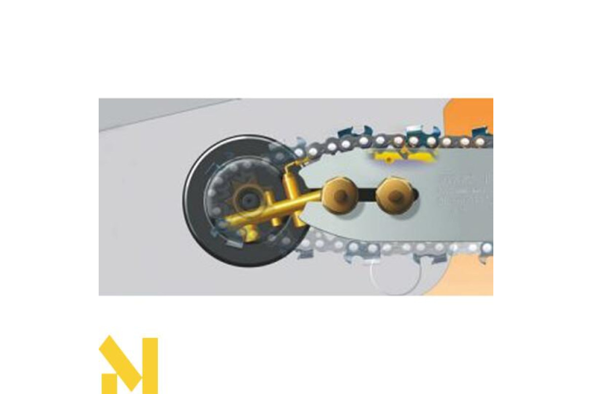 безпечного механізму регулювання натягу пильного ланцюга без зняття кришки з ланцюгової зірочки. Підтягнути ланцюг можна через бічний отвір у цій кришці;