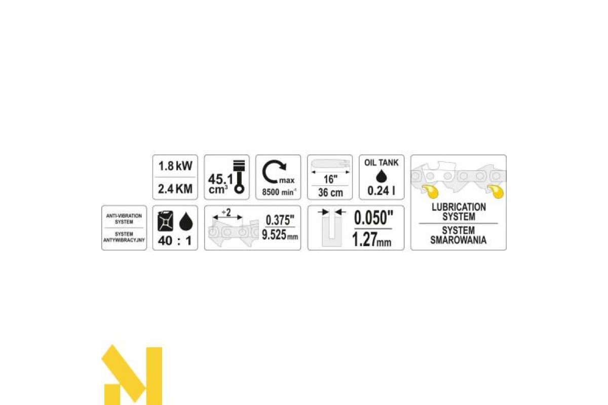 Міцна і ергономічна ланцюгова пила для комфортної та легкої роботи. У неї є системи, які підвищують безпеку і комфорт користувача. Використовувані параметри підвищують ефективність інструменту і дозволяють використовувати його в сучасних садових роботах. Добре працює при зрізанні дерев і зрізання кущів і гілок.