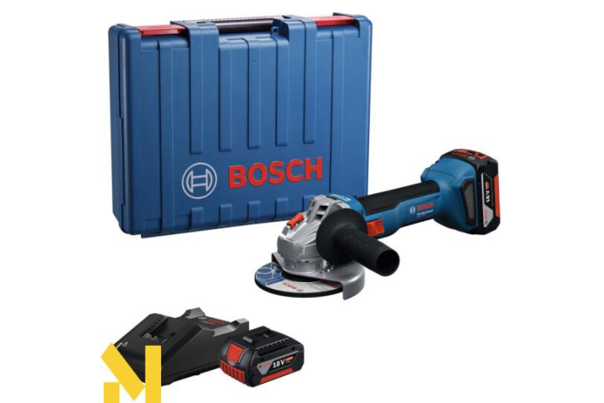 У комплекті цього артикулу, крім шліфувальної машини, ви знайдете: захисний кожух, ключ під два отвори, затискну гайку, додаткове руків'я та кріпильний фланець. Усе це упаковано в міцний чемодан, так само в ньому розміщено 2 акумуляторні батареї GBA 18V 4 Ah і зарядний пристрій GAL 18V-40.