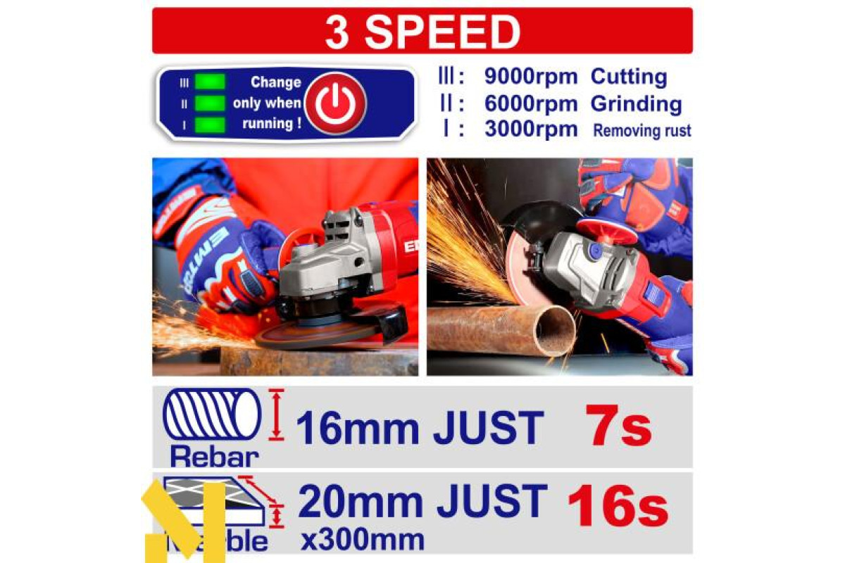 Emtop ELAG271532 оснащена потужним двигуном, що дозволяє виконувати роботи швидко та без зусиль. Висока потужність інструмента забезпечує чудову продуктивність, дозволяючи обробляти великі обсяги матеріалів за короткий час.