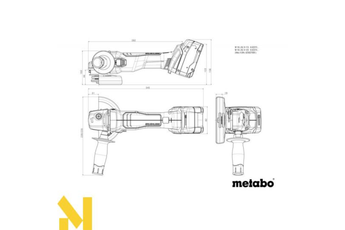 Каркас акумуляторної болгарки Metabo W 18 L BL 9-125 належати до початкової лінійки безщіткових, акумуляторних болгарок від фірми Metabo. Компактні розміри, максимальна зручність у роботі та велика потужність – це основні особливості даної моделі. У цю комплектацію не входять акумуляторні блоки та зарядний пристрій.