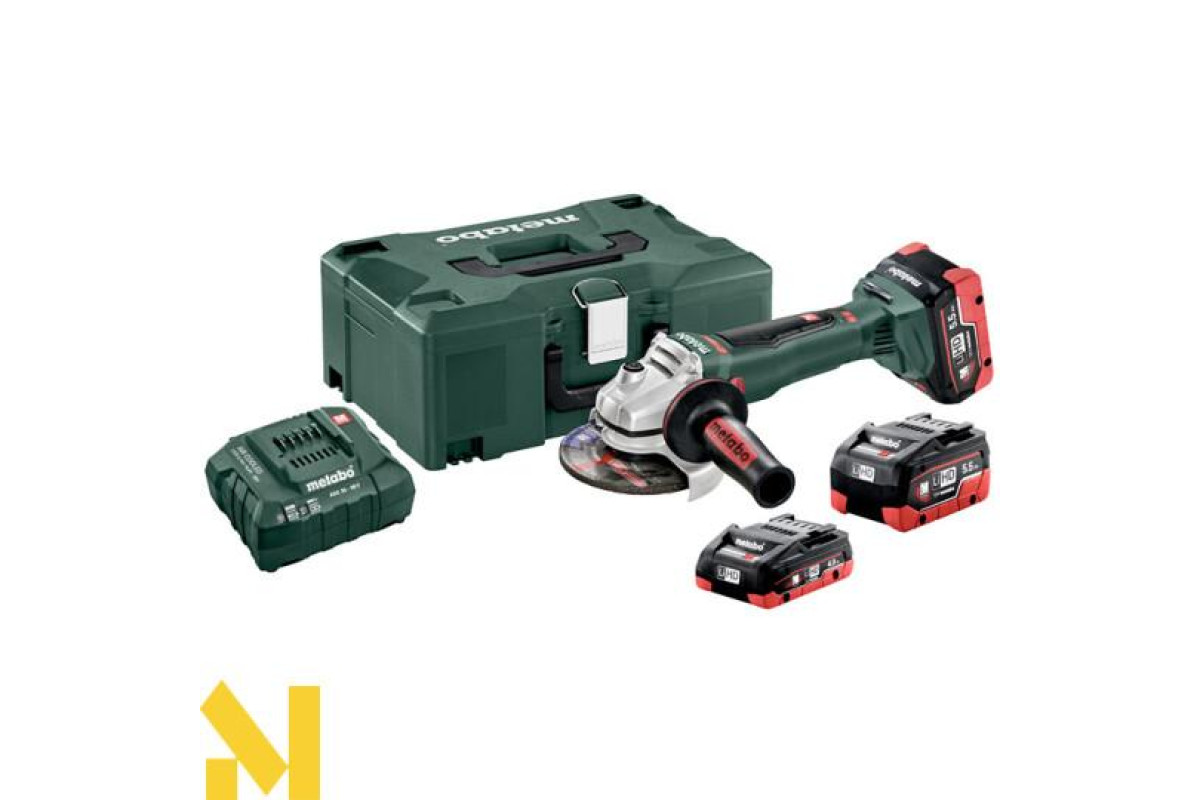 Акумуляторна болгарка Metabo WB 18 LTX BL 125 Quick LiHD 2x5.5 Ач + 1x4.0 Ач в комплектації з акумуляторними блоками серії LiHD, два з яких мають ємність 5.5 Ач і один 4.0 Ач.