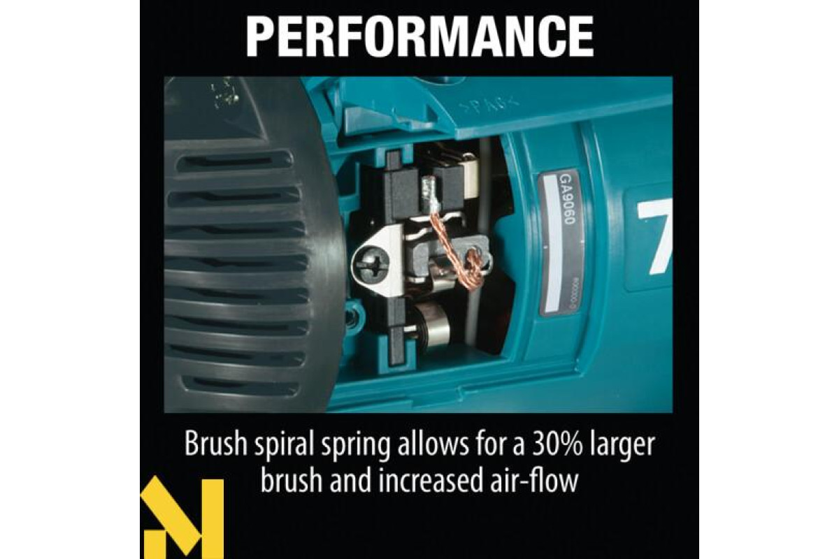 Кутова шліфмашина Makita GA9060 - це компактний і потужний інструмент масою всього 5,5 кг. Болгарка обладнана системою захисту від перевантаження, яка запобігає перегріву двигуна. Зигзагоподібне покриття якоря та посилена ізоляція статора дозволяють використовувати болгарку в екстремальних умовах. Компактна конструкція і невелика загальна довжина забезпечують зручне управління інструментом і високу маневреність.