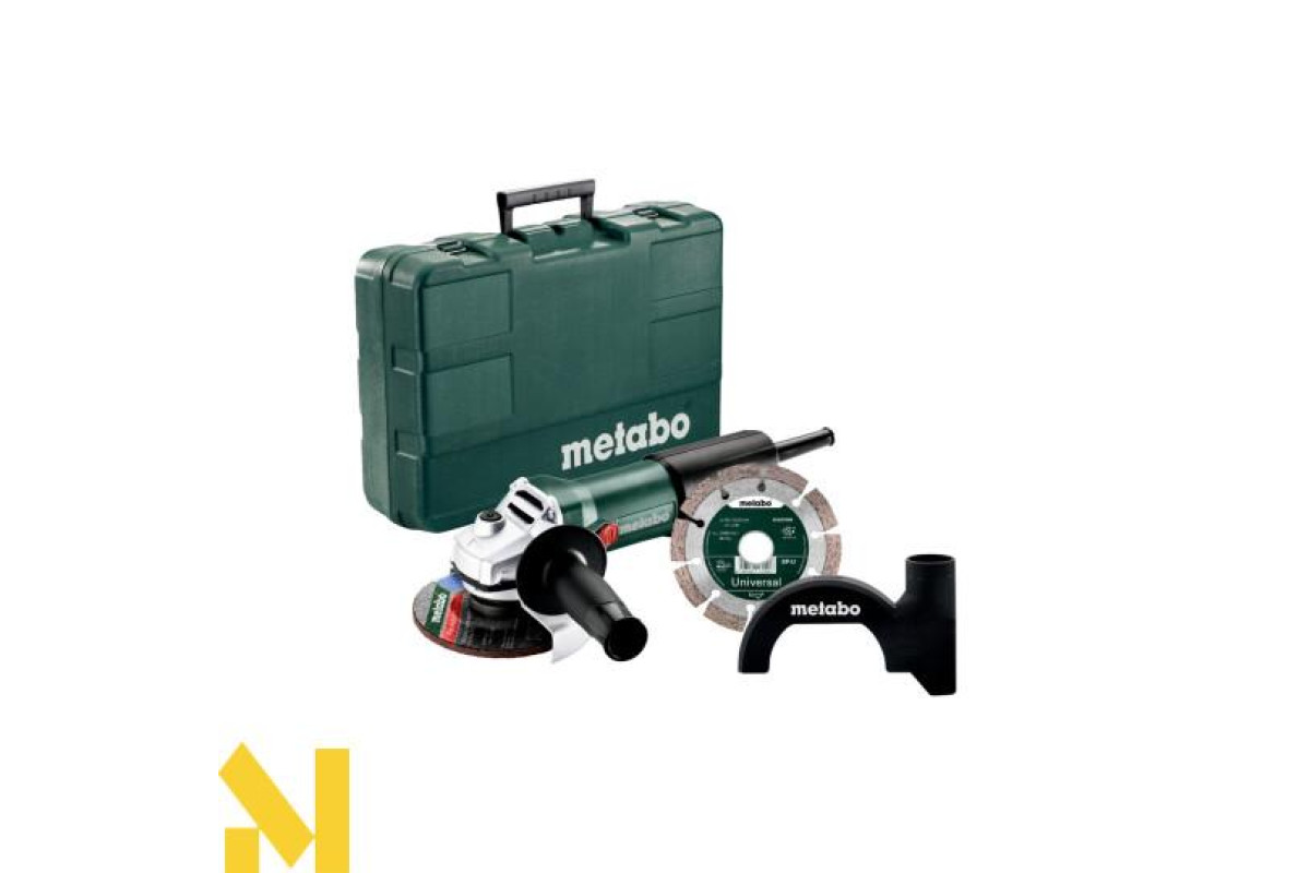 Болгарка Metabo WEV 850-125 Set - розширена комплектація, легкої 850 Вт болгарки з регулюванням обертів, до якої входить кожух CED 125 Clip, алмазний диск бетону та пластиковий кейс.