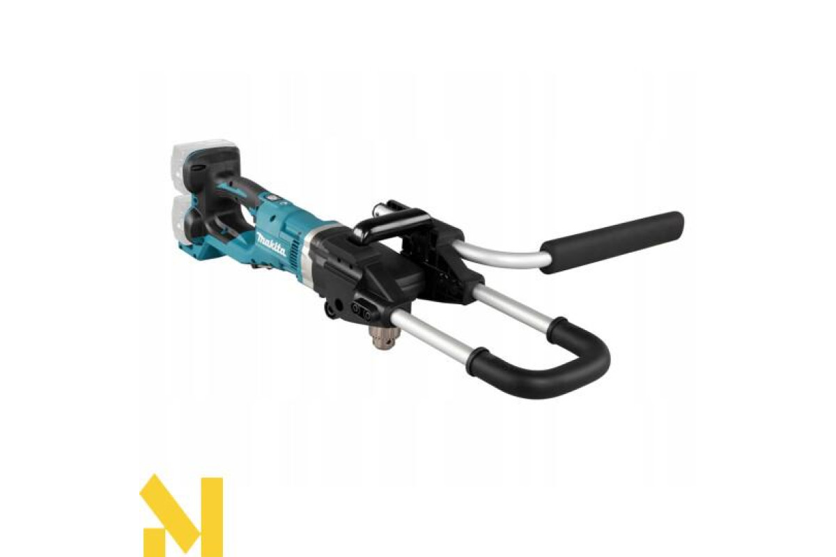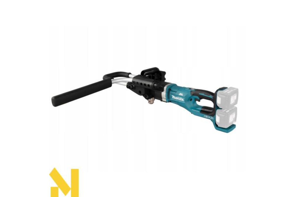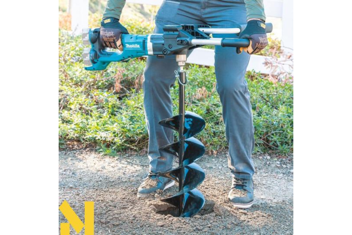 Акумуляторний садовий бур обладнаний безщітковим мотором потужністю 1350 Вт, що відповідає 1.84 л.с. - прийнятний показник, якщо порівнювати з бензиновими землебурами. Крутний момент на першій швидкості - 136 Нм, на другий - 48 Нм. Живлення 36 В забезпечує пара 18 В блоків. Ямобур MAKITA DDG460ZX7 може свердлити в грунті отвори до 200 мм в діаметрі, на глибину 550 мм, і при наявності подовжувача до 1000 мм. Шнек ставиться в інструмент з допомогою спеціального адаптера, той, в свою чергу, надійно затискається в сталевий кулачковий патрон, для цього в комплекті є ключ.