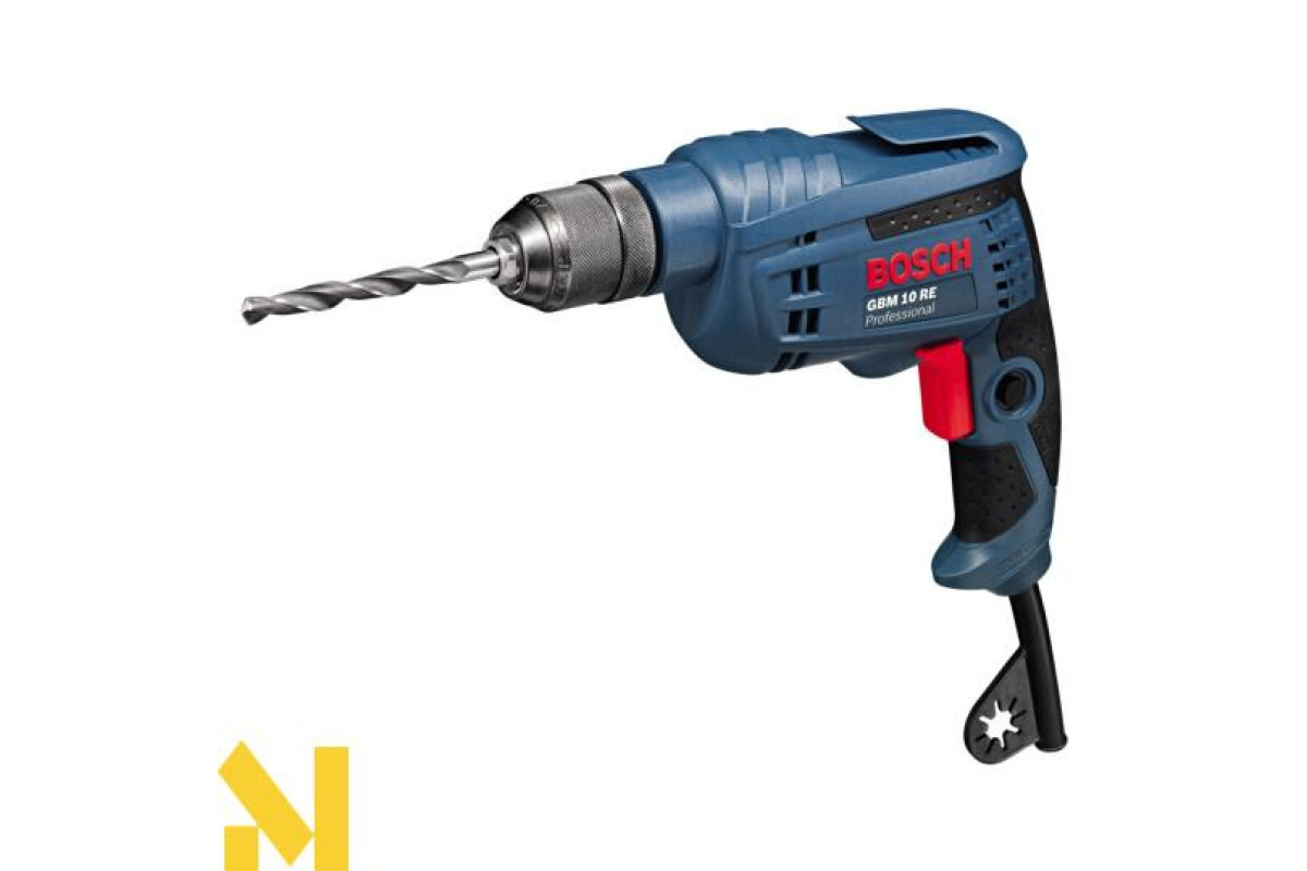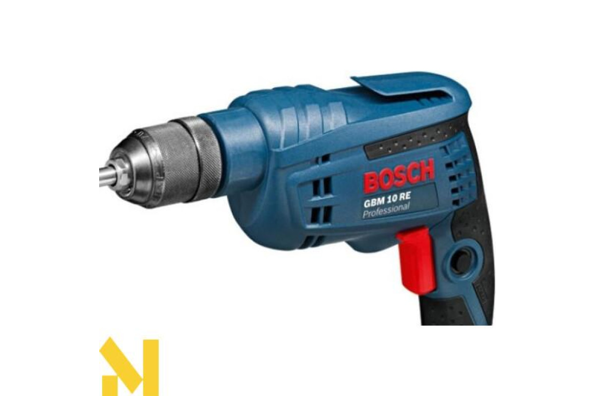 Електродриль Бош GBM 10 RE виконана в ергономічному дизайні, який передбачає всі якості і можливості для свердління в обмежених просторах і свердління над головою в природних умовах експлуатації. Крім того апарат можна сміливо використовувати для роботи у важких умовах, так як його корпус виконаний з високоякісних ударостійких матеріалів, що робить дриль незамінним помічником для серійного свердління. Безударна дрель Bosch GBM 10 RE завдяки своєму компактному виконанню призначена для роботи у важкодоступних місцях. Модель дуже вдало оснащена електричним модулем контролю оборотів для насверліванія отвори і часто застосовується для свердління отворів невеликого діаметра. Завдяки наявності потужного електричного приводу дриль Bosch GBM 10 RE є високопродуктивним електроінструментом, так як двигун здатний забезпечити споживача 2600 об / хвилину. Високоспритний дриль GBM 10 RE гарантує високу точність в роботі і довговічність, так як всі робочі вузли оснащені кульковими і роликовими підшипниками, а наявність реверсу і швидкозатискного патрона дає додаткову перевагу і комфорт у використанні даної моделі.