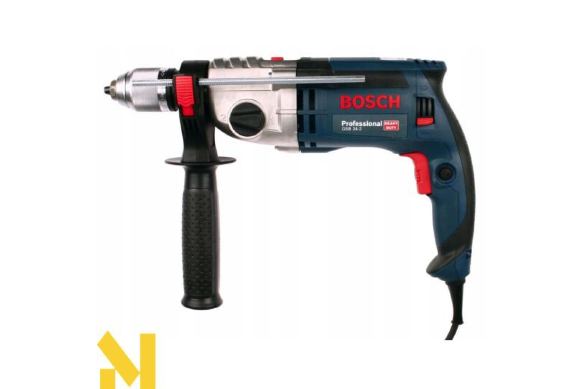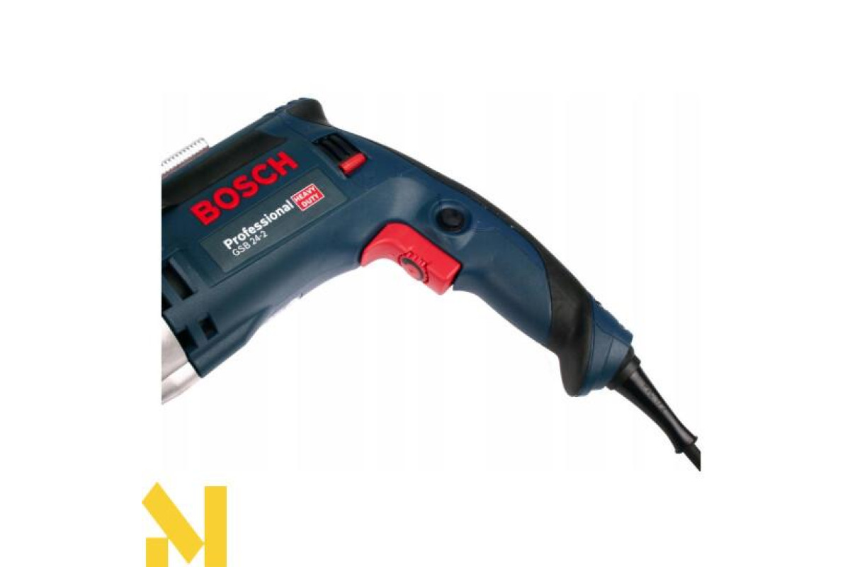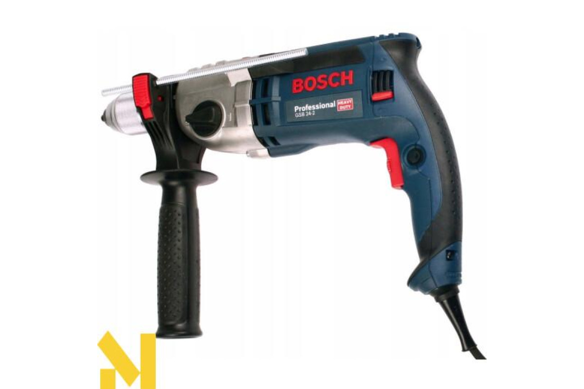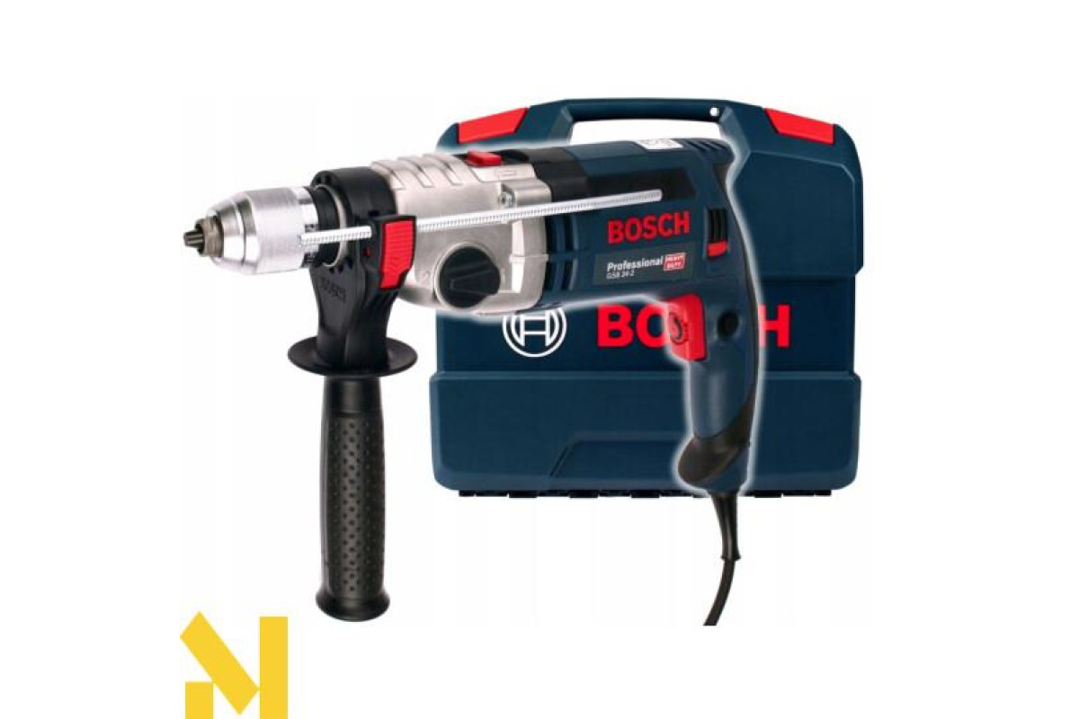 Ударний дриль Bosch GSB 24-2 потужністю 1100 Вт. Двохшвидкісна (0-900 / 3000 об/хв) з швидкозажимний патроном з діапазоном затиску 1,5-13 мм. Ударний механізм робить 0-15300 / 51000 уд/хв. Крутний момент 40 / 14,5 Нм. Різьба свердлильного шпинделя 1/2 "-20 UNF. Дриль виготовляє отвори в бетоні діаметром 22/13 мм, в камені і цегляній кладці - 24/16 мм, в деревині - 40/25 мм, металах - 16/8 мм. Доставляється в практичному L-Case з швидкозажимний патроном 13 мм, обмежувачем глибини (210 мм), додатковою рукояткою.