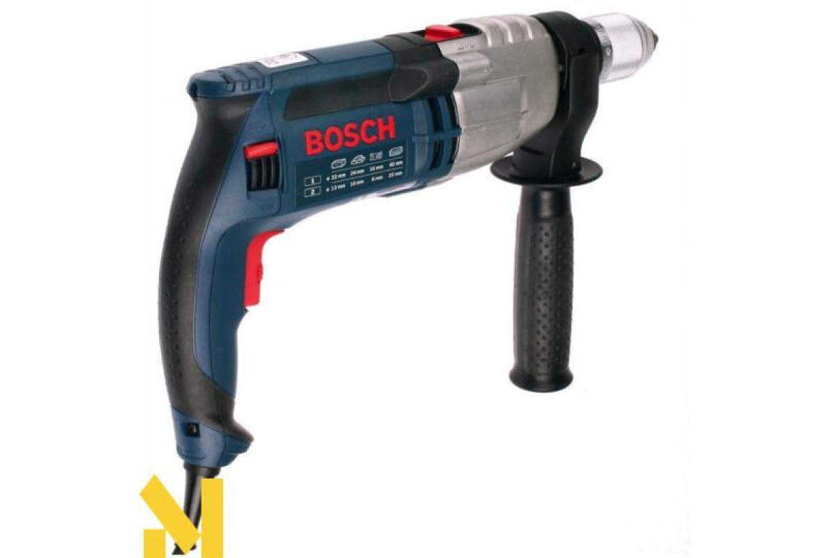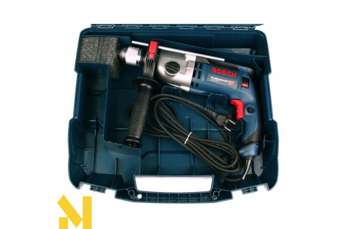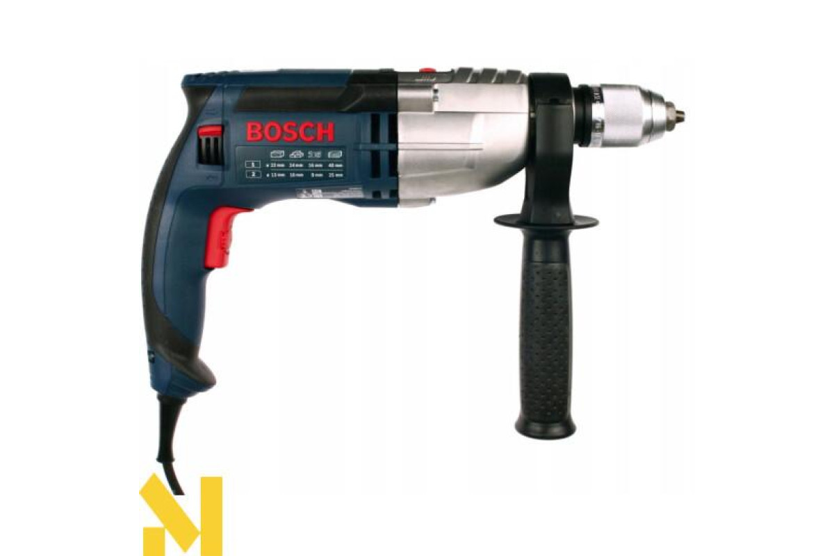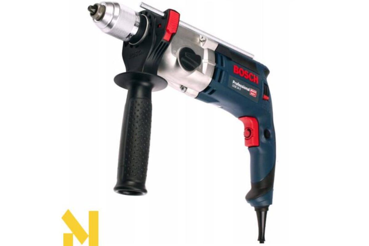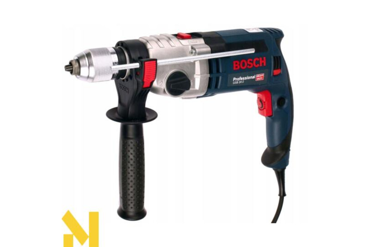 Ударний дриль Bosch GSB 24-2 потужністю 1100 Вт. Двохшвидкісна (0-900 / 3000 об/хв) з швидкозажимний патроном з діапазоном затиску 1,5-13 мм. Ударний механізм робить 0-15300 / 51000 уд/хв. Крутний момент 40 / 14,5 Нм. Різьба свердлильного шпинделя 1/2 "-20 UNF. Дриль виготовляє отвори в бетоні діаметром 22/13 мм, в камені і цегляній кладці - 24/16 мм, в деревині - 40/25 мм, металах - 16/8 мм. Доставляється в практичному L-Case з швидкозажимний патроном 13 мм, обмежувачем глибини (210 мм), додатковою рукояткою.