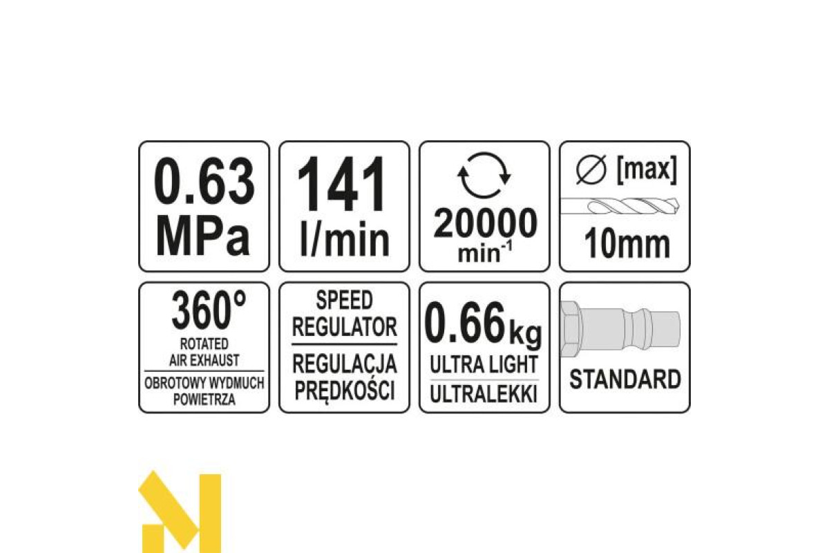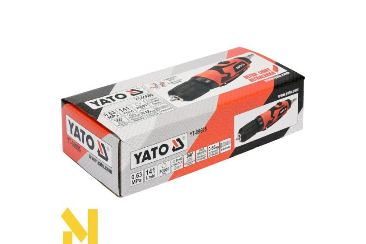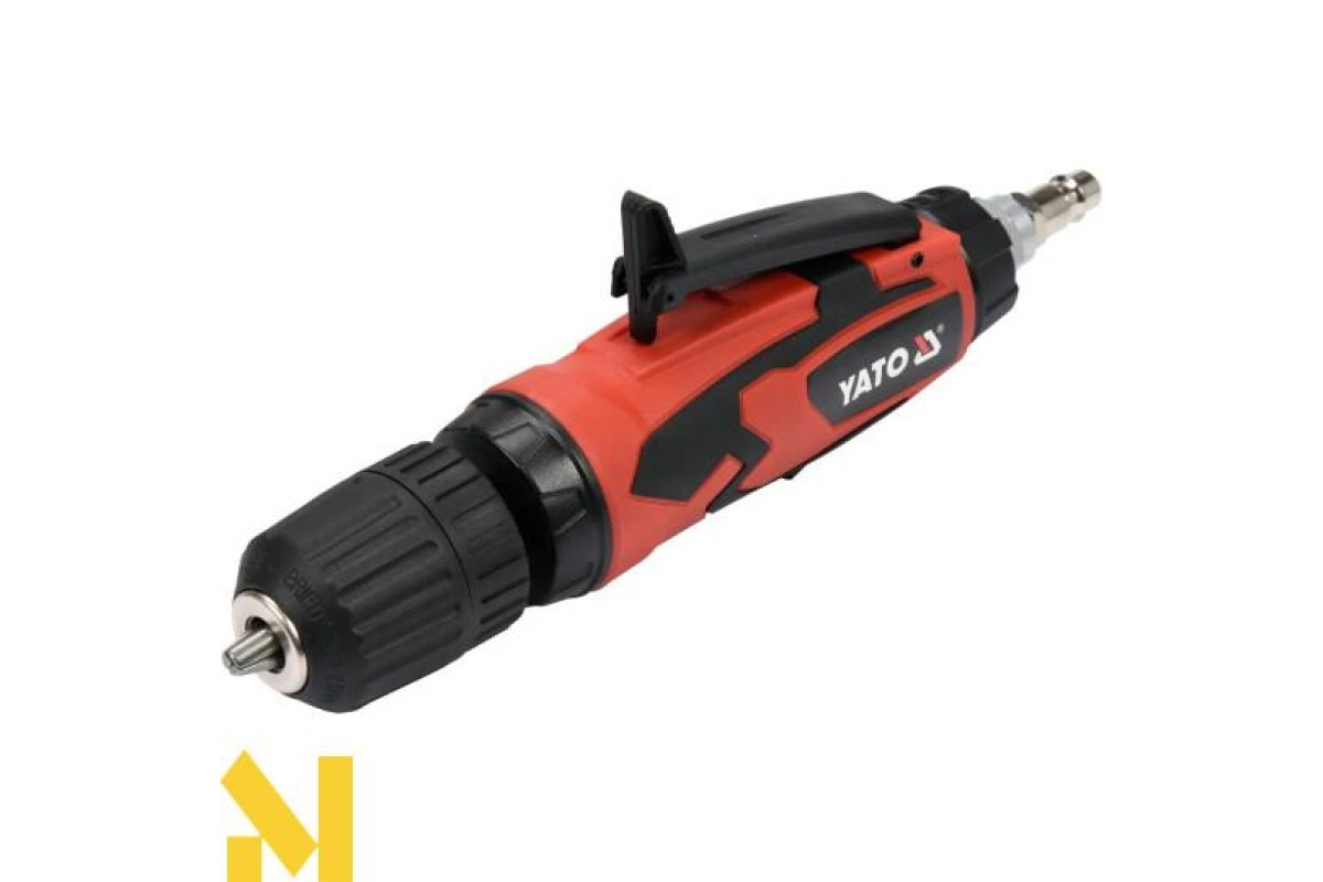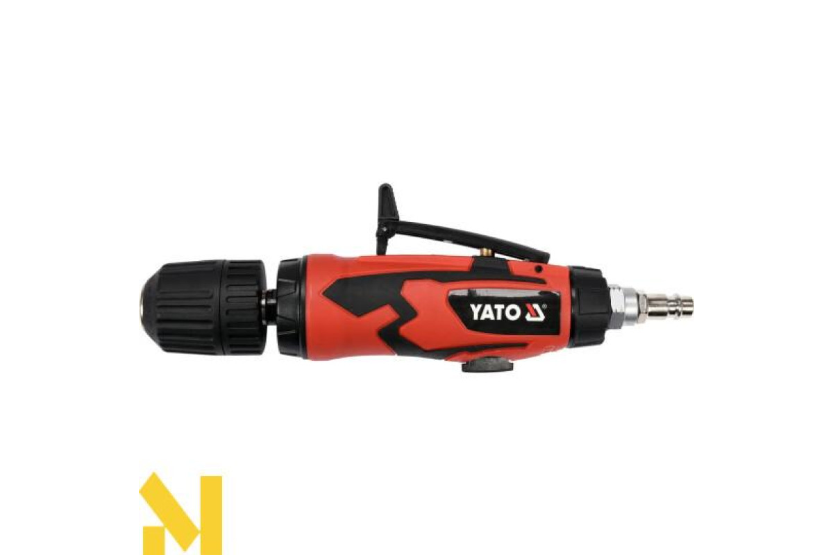 Професійна пневматична дриль YATO YT-09695 працює за допомогою стисненого повітря під тиском. Призначена для свердління в деревині, металі, пластику, а також, при необхідності свердління без удару. Ідеально підходить для роботи в приміщеннях з обмеженим простором. Застосовується в автомобільних сервісах і в промисловості.