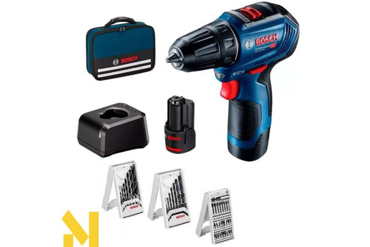 Акумуляторний дриль-шурупокрут Bosch GSR 12V-30 Professional (0615990M4E) у комплекті з 2 акумуляторами 12В 2 Ah, зарядним пристроєм GAL 12V-20, трьома наборами: з 7 свердел по металу, 7 свердел по деревині та 25 викруткових біт. Bosch GSR 12V-30 - практичний, зручний, надійний 2-швидкісний акумуляторний шурупокрут із живленням від знімного акумулятора Li-Ion 12 В і ємністю 2 А-год. Ергономіка інструменту Bosch GSR 12V-30 досконала: компактні форми, прогумована рукоятка, світлодіодне підсвічування PowerLight, індикатор заряду. Для зміни оснащення в шурупокруті Bosch GSR 12V-30 використовується швидкозатискний патрон 10 мм з Auto-Lock. В акумуляторному дрилі-шурупокруті Bosch GSR 12V-30 реалізовано оптимальне налаштування крутного моменту для високоточного загвинчування саморізів із числом ступенів крутного моменту 20+1. Розширені функції під рукою - для загвинчування та свердління.