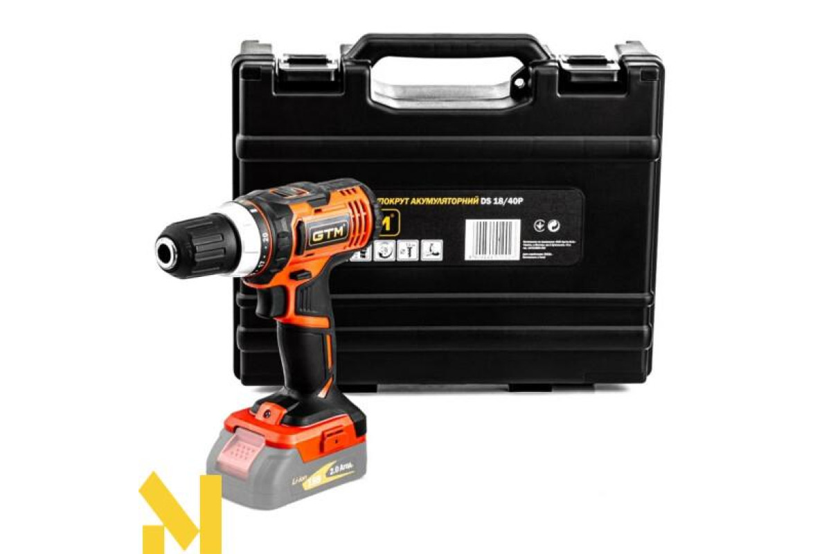 GTM DS18/40P - дриль-шуруповерт професійного класу з живленням від Li-Ion акумуляторів напругою 18 В. У шурупокруті встановлений швидкозатискний 13 мм патрон для роботи з бітами та свердлами. Редуктор у цій моделі двоступеневий, що дає змогу регулювати максимальну швидкість залежно від завдання. У цій моделі є 20 режимів для закручування кріплень, з максимальним крутним моментом 40 Н*м, а також режим свердління.