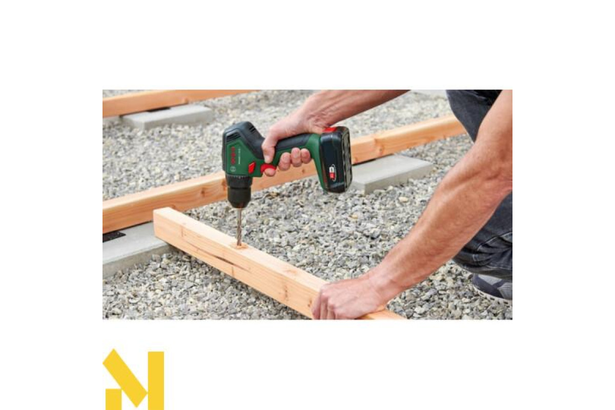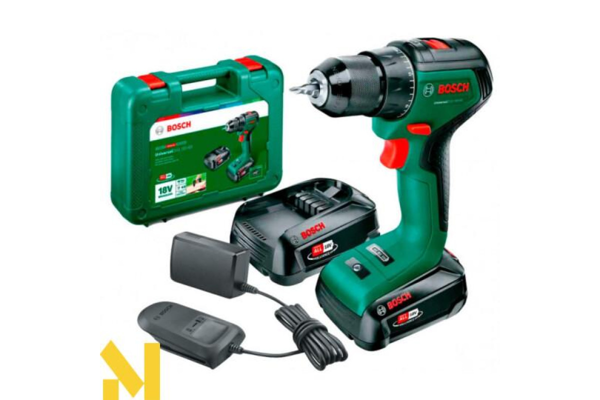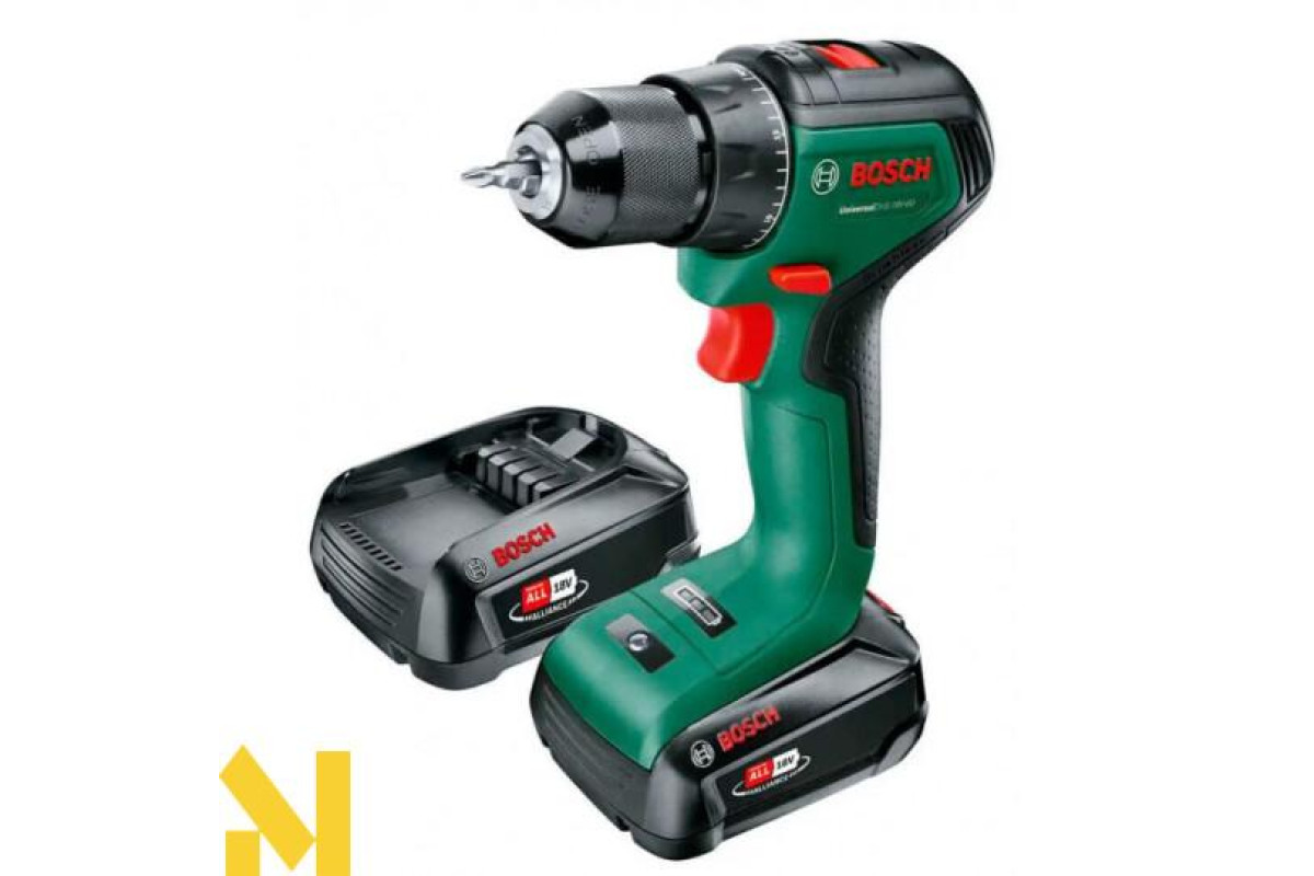 Акумуляторний інструмент Bosch UniversalDrill 18V-60 поєднує у собі 2 функції — дриля та шурупокрута. Живиться від літій-іонної батареї на 18 В (у комплекті 2 батареї, ємність яких по 2 Ач). Оснащений апарат швидкозатискним патроном, діаметр якого 13 мм. Налаштовується крутний момент до 60 Нм (20 позицій), швидкість обертання біти чи свердла сягає 500 об/хв та 1900 об/хв (залежить від щільності робочого матеріалу — деревини, сталі). Важить дриль-шурупокрут 1.3 кг. Доставляється він у кейсі з 2 акумуляторами, зарядним пристроєм до них.