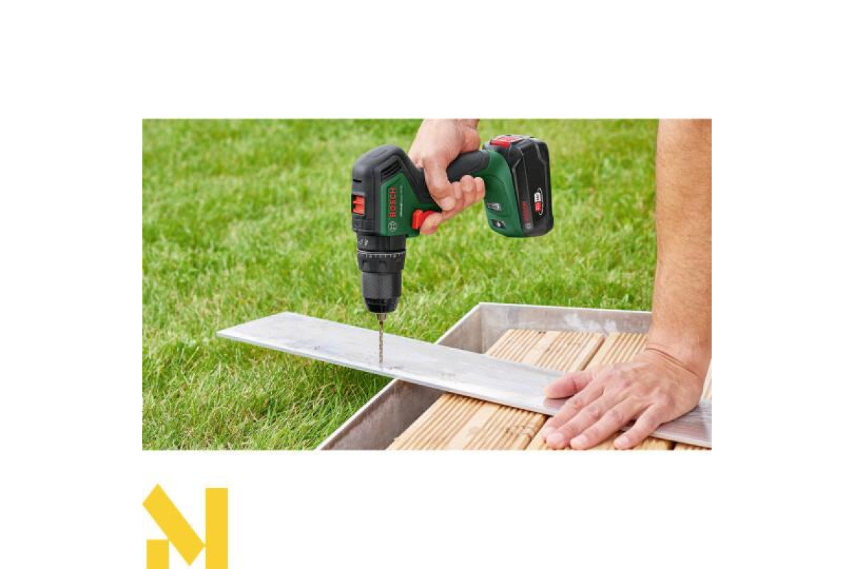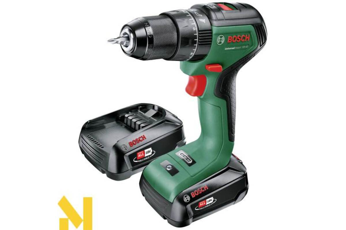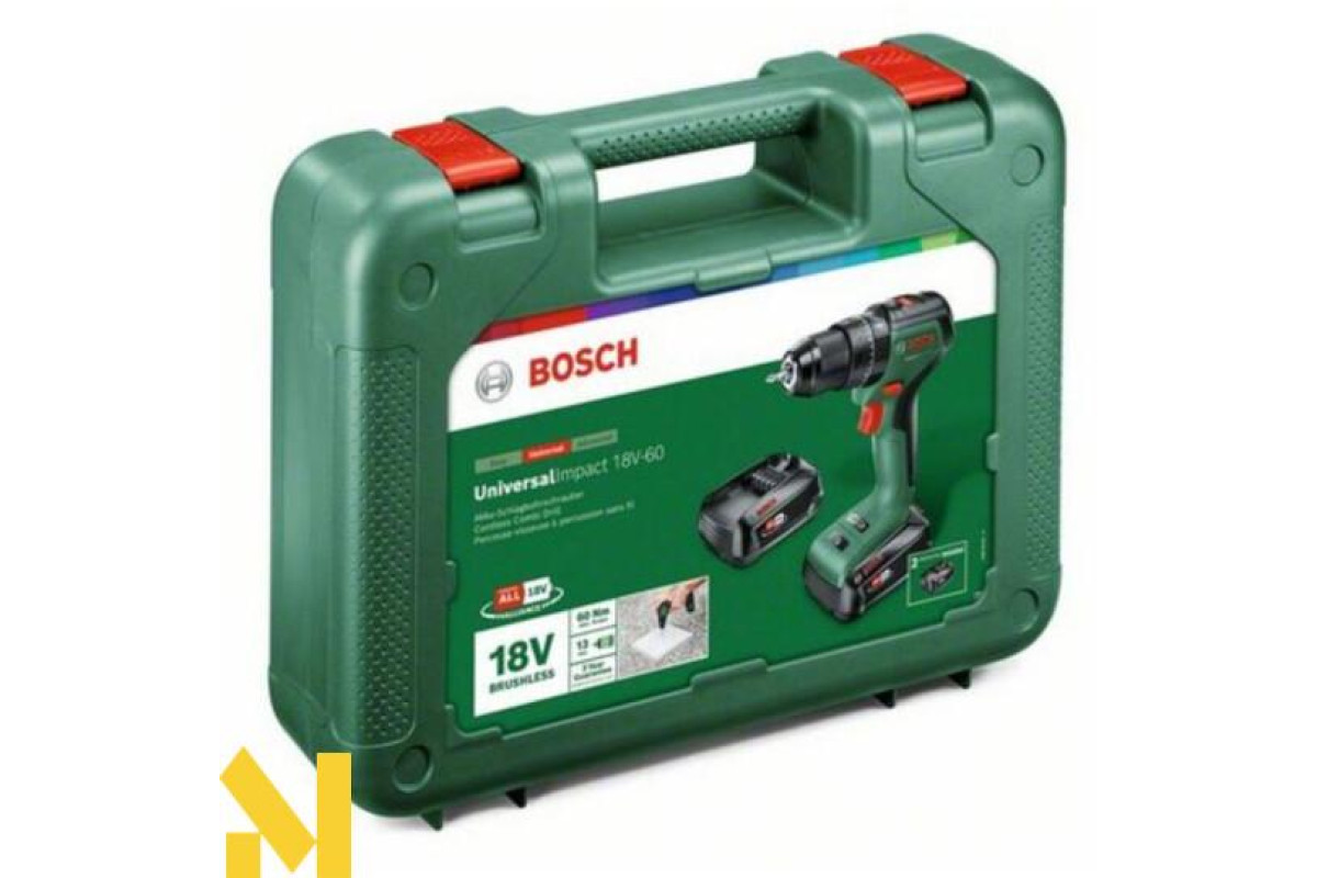 Акумуляторний ударний дриль-шуруповерт Bosch Universal Impact 18 V-60 живиться від акумулятора на 18 В. Момент, що крутить, виставляється 20+2 положеннями, максимальне значення 60 Нм. Має 2 швидкості – 0-500 об/хв та 1900 об/хв. Кількість ударів – 0-28500 уд/хв. Закручує кріплення, свердлить отвори в металі, деревині, пластмасі. Швидкозатискний патрон працює з максимальним діаметром свердла 13 мм. Діаметр шурупа – 10 мм. Важить інструмент 1.3 кг. Комплектується 2 акумуляторами ємністю 2 Aч, зарядним пристроєм.
