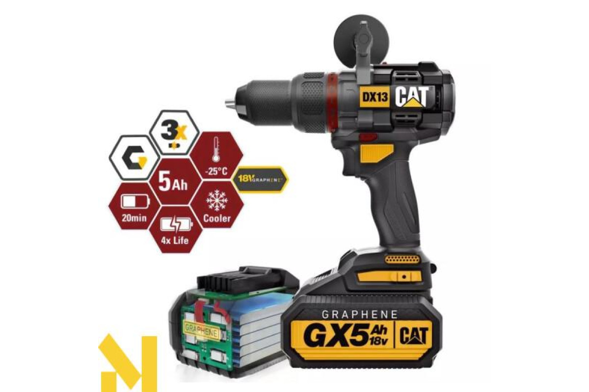 Дриль-шуруповерт CAT DX13 використовує інноваційну технологію з графеновим акумулятором. Вони швидше заряджаються та мають довший термін служби. Графеновий полімер інтегрований в катод акумуляторних елементів для підвищення продуктивності батареї. Завдяки цьому, графенові батареї мають суттєві переваги перед літій-іонними, а саме: повна зарядка за 20 хв, може працювати при температурі до -25˚C, у 4 рази довший термін служби, ніж у літій-іонного акумулятора.