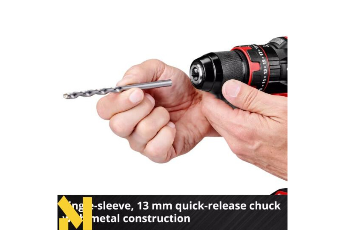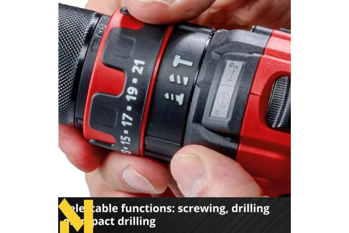 Інструмент оснащено функцією ударного свердління, що дозволяє обробляти тверді поверхні, такі як цегла та камінь. Завдяки 21-ступеневому регулюванню крутного моменту, електронному контролю обертів та ударному режиму, користувач легко адаптує інструмент до конкретного завдання — від точного загвинчування до потужного свердління.